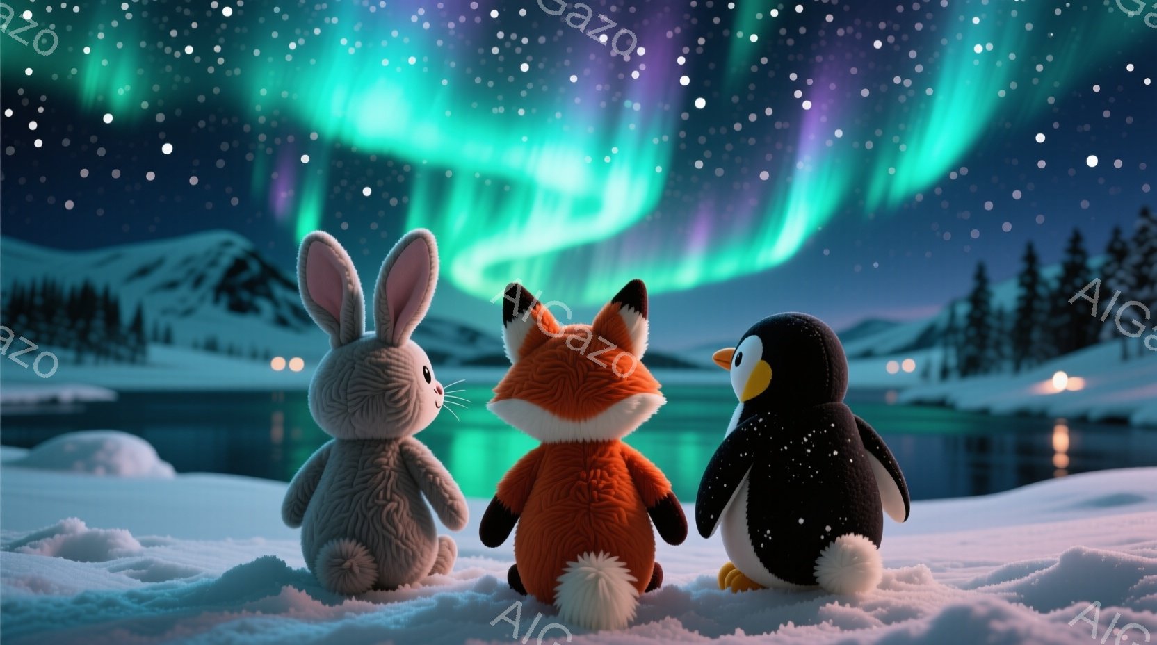 白い雪景色の中に、ウサギ、キツネ、ペンギンの3匹の動物が並んで座っています。夜空にはオーロラが輝き、雪原には小さな白い花が咲いています。動物たちは皆、穏やかな表情で夜空を見上げているようです。
