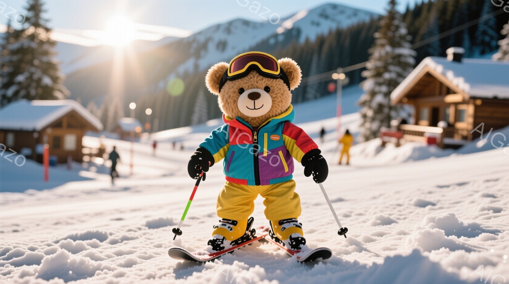 白い雪景色の中に、カラフルなスキーウェアを着たテディベアが立っている。鮮やかなピンク、青、黄色、オレンジ色のウェアに身を包み、黒いゴーグルをかけてスキー板に立っており、元気いっぱいの表情を見せている。背景には、木造の建物と雪をまとった山々が広がり、晴れた空の下、冬の活気ある雰囲気が漂っている。