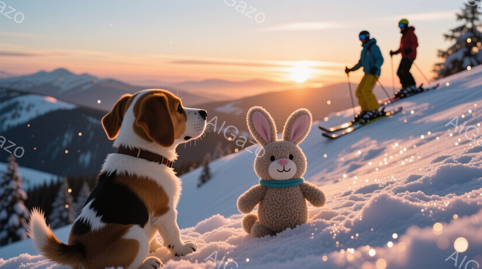 雪山を背景に、茶色いぬいぐるみウサギと犬が寄り添って立っています。犬は首輪をつけており、遠くに見えるスキーヤーを見つめています。背景には夕焼けのような暖かな光が広がり、雪景色と相まって穏やかな雰囲気を醸し出しています。
