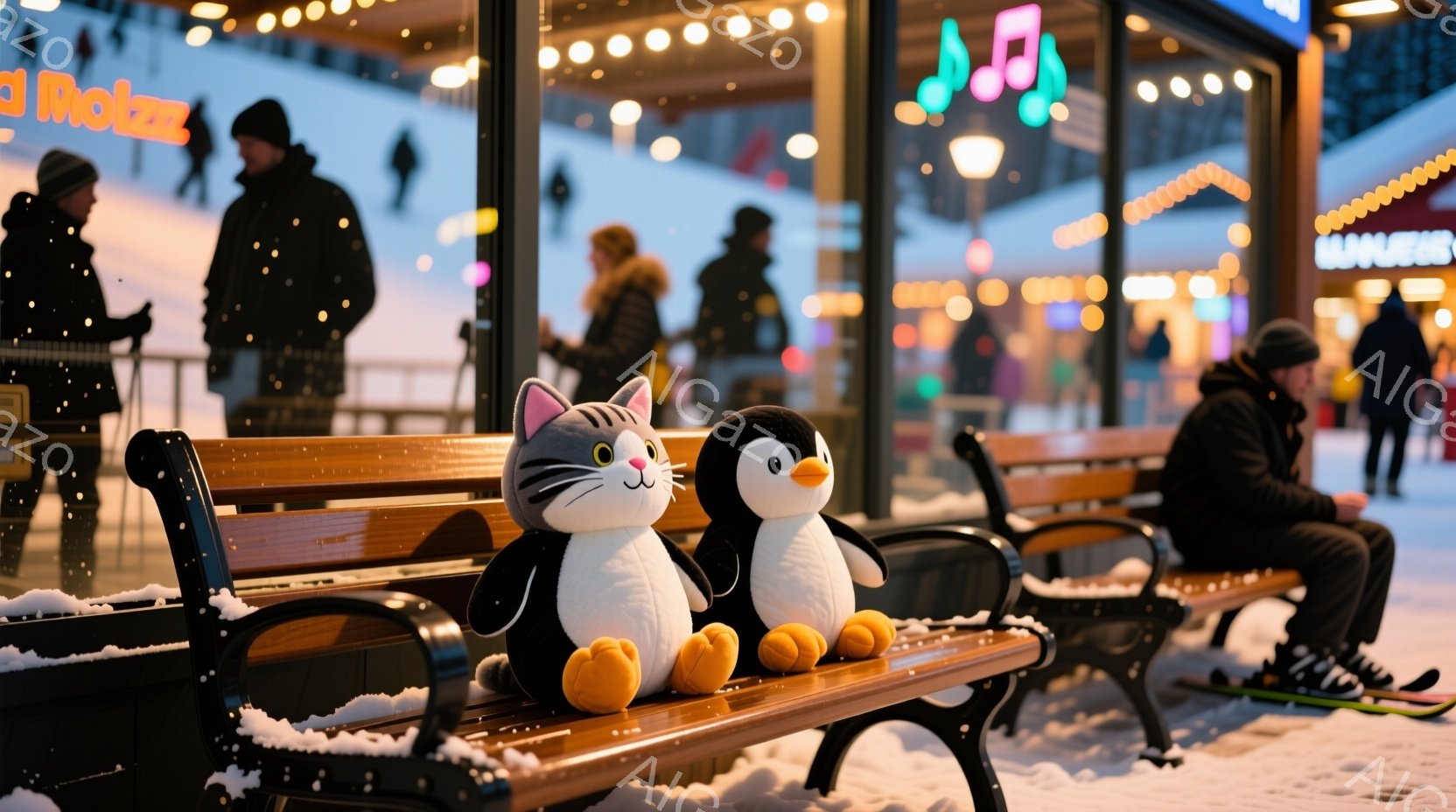 雪が降る夜のベンチに、可愛らしいぬいぐるみ、茶色の縞模様の猫と白いペンギンが座っています。背景にはスキー場があり、人々がスキーを楽しんでいるのがぼんやりと見え、暖かい光で照らされた建物が並んでいます。全体的に、温かく幻想的な冬の夜の雰囲気が漂っています。