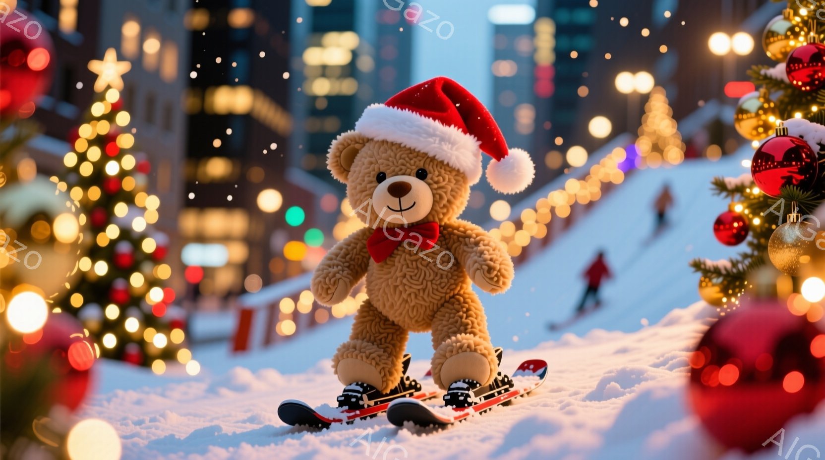 ふわふわの茶色のテディベアが、赤いサンタ帽と蝶ネクタイをつけ、スキー板に立っている。背景には、ぼやけたクリスマスツリーやイルミネーション、そして遠くに見える都市の建物があり、雪が降る冬の風景が広がっている。全体的に、暖かく、お祝いの雰囲気で、クリスマスの季節を彷彿とさせる。