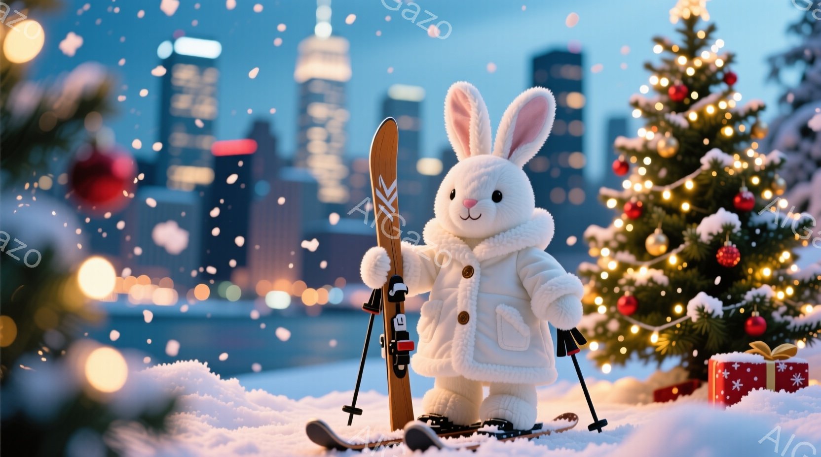 雪景色の中に、スキー板を履いた白いウサギが立っている。ウサギは白いコートを着ており、片手にスキースティックを持っている。背景には雪に覆われた建物群がぼんやりと見え、クリスマスの飾り付けがされたクリスマスツリーが左側に配置され、冬の暖かく幻想的な雰囲気を醸し出している。