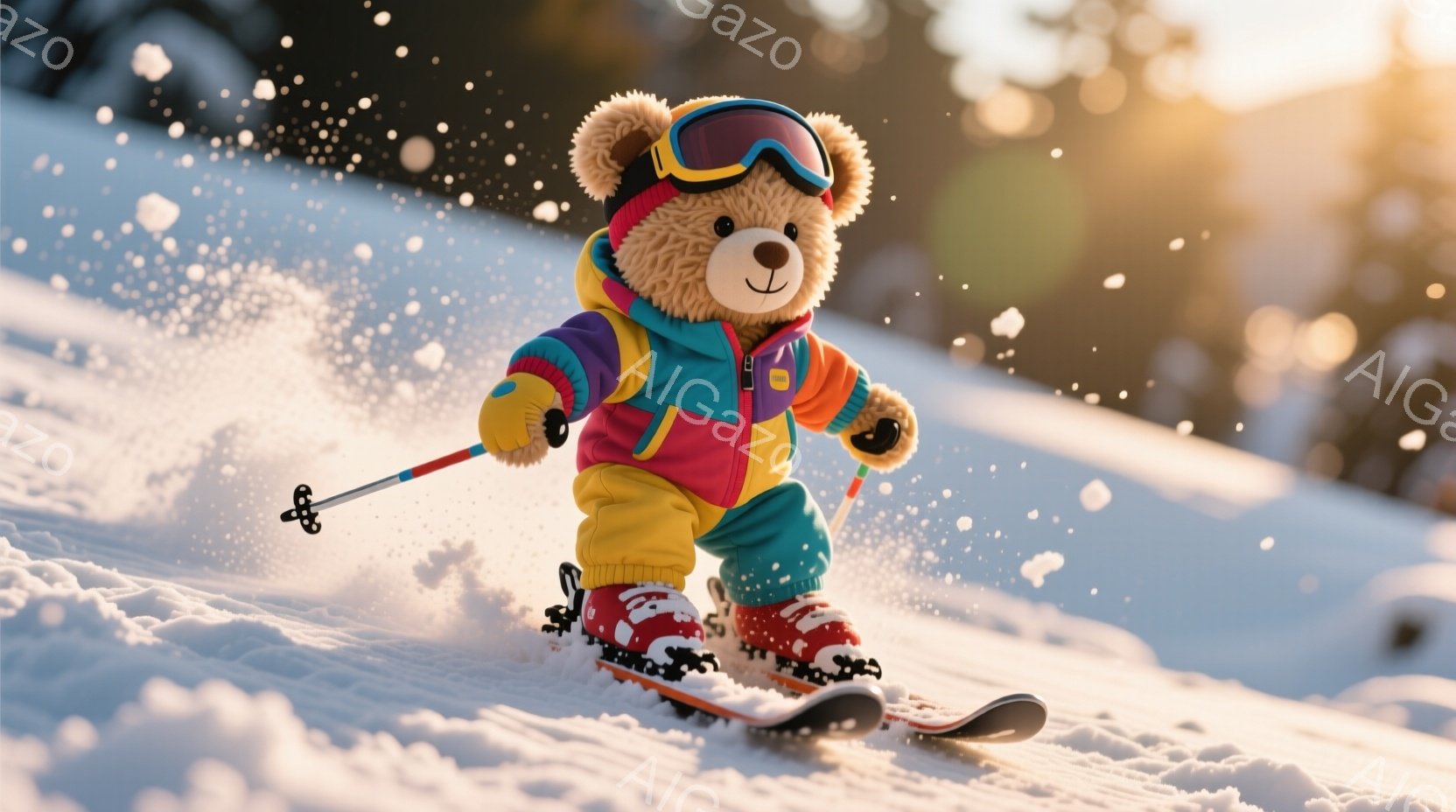 スキーウェアを着たテディベアが雪の上を滑走している様子を捉えています。鮮やかなピンク、青、オレンジ色のスキーウェアとゴーグルを身につけ、片手にスキーポールを持ち、前進する姿勢を見せています。背景は雪景色で、雪が舞い上がっており、快活で遊び心のある雰囲気を醸し出しています。