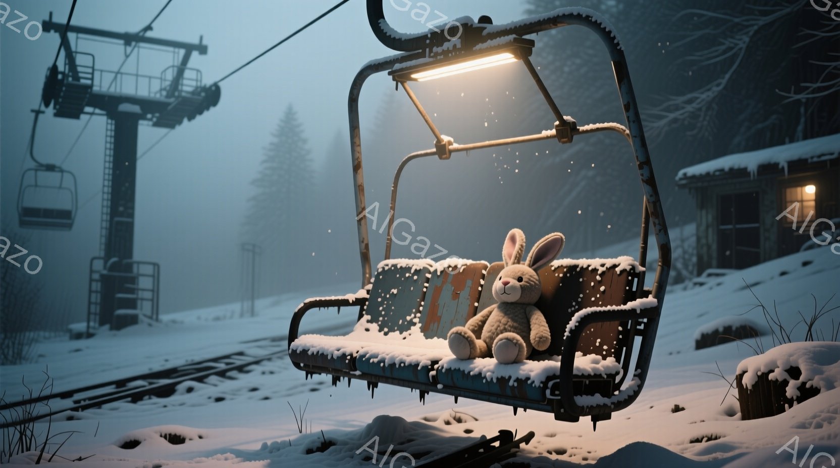 雪に覆われたゴンドラの椅子に、灰色のうさぎのぬいぐるみが座っている。背景には薄暗い森と、雪が降る荒廃したゴンドラ駅舎が見え、全体的に寂しげで物悲しい雰囲気が漂っている。錆び付いたゴンドラと降り積もる雪が、時間の経過と忘れ去られた場所という印象を与える。