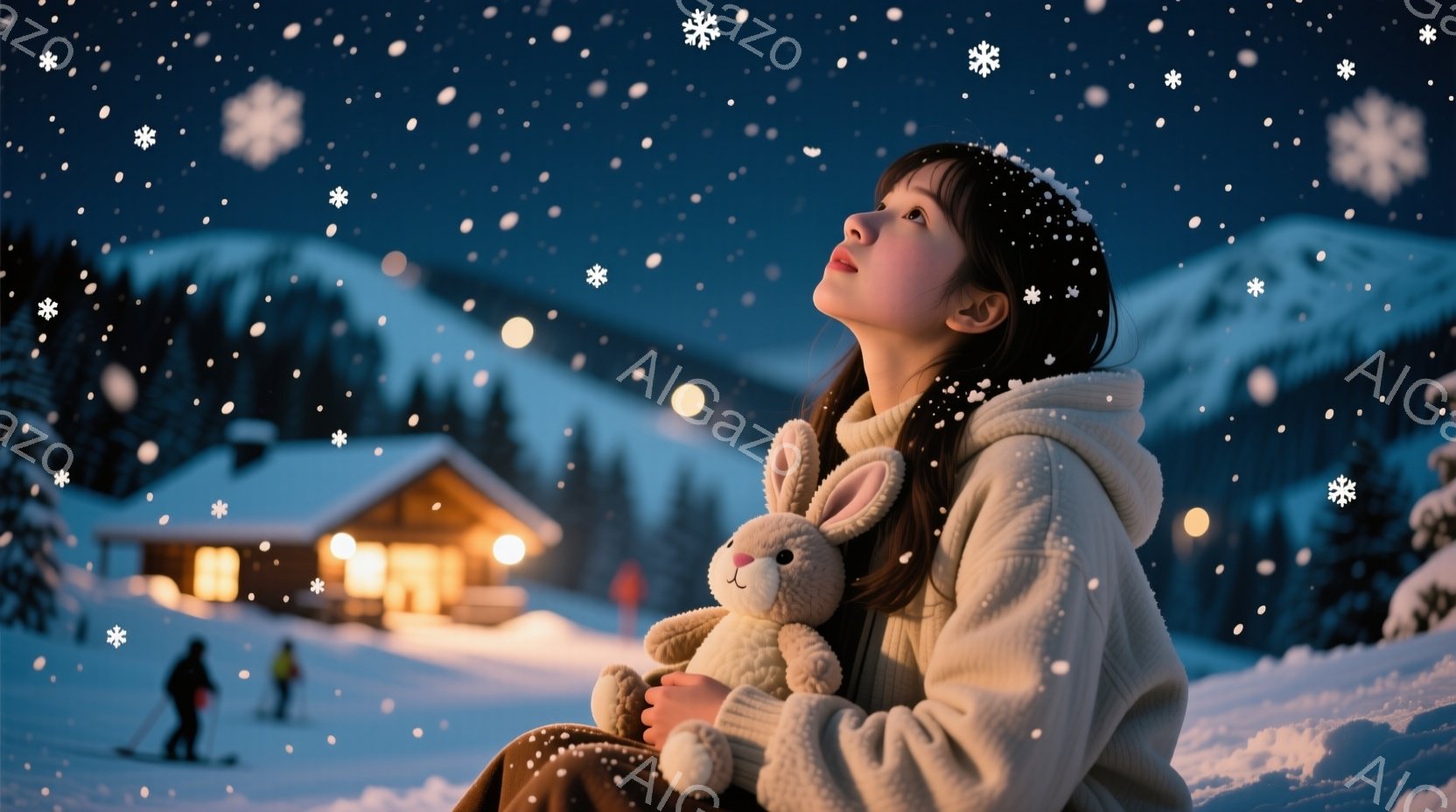 雪が降り積もる夜、少女が膝の上に大きな白いウサギのぬいぐるみを抱き、空を見上げています。彼女はセーターを着ており、長い髪は自然に肩から流れ落ちています。背景には、温かい光を灯した小さな木造の家があり、雪景色の中に暖かさと静寂が漂います。