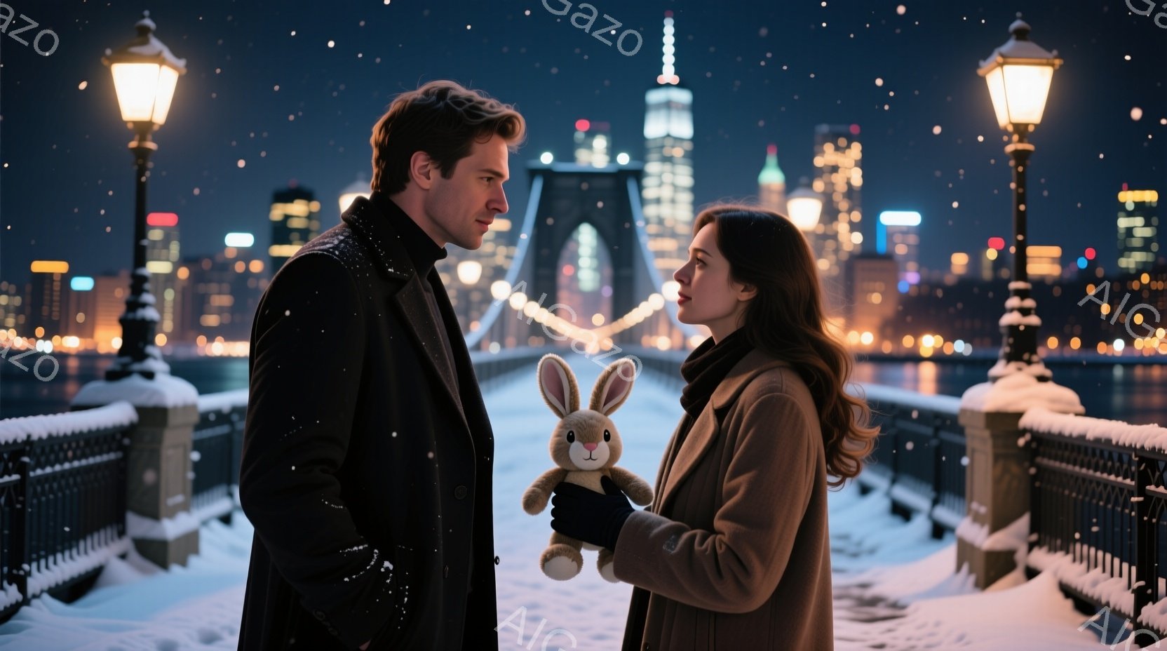 雪が舞う夜の橋の上で、一対の男女が立っている。男性は黒いコートを着ており、女性はベージュのコートを着て、手に灰色のウサギの人形を抱いている。背景には、ニューヨークの夜景が広がり、雪景色と夜景の光が幻想的な雰囲気を醸し出している。