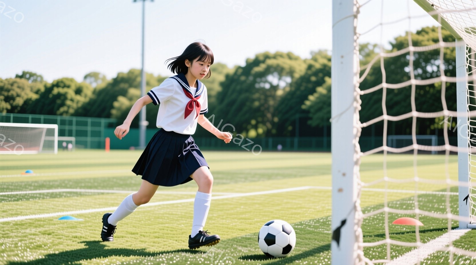緑の芝生の上を、紺色のスカートと白いシャツの制服を着た少女がサッカーボールをドリブルしている。彼女は長い髪をポニーテールにしており、少し前かがみの姿勢でボールを見つめている。背景にはサッカーゴールと他の選手がぼんやりと見え、晴れた空の下、活気のある練習風景が広がっている。