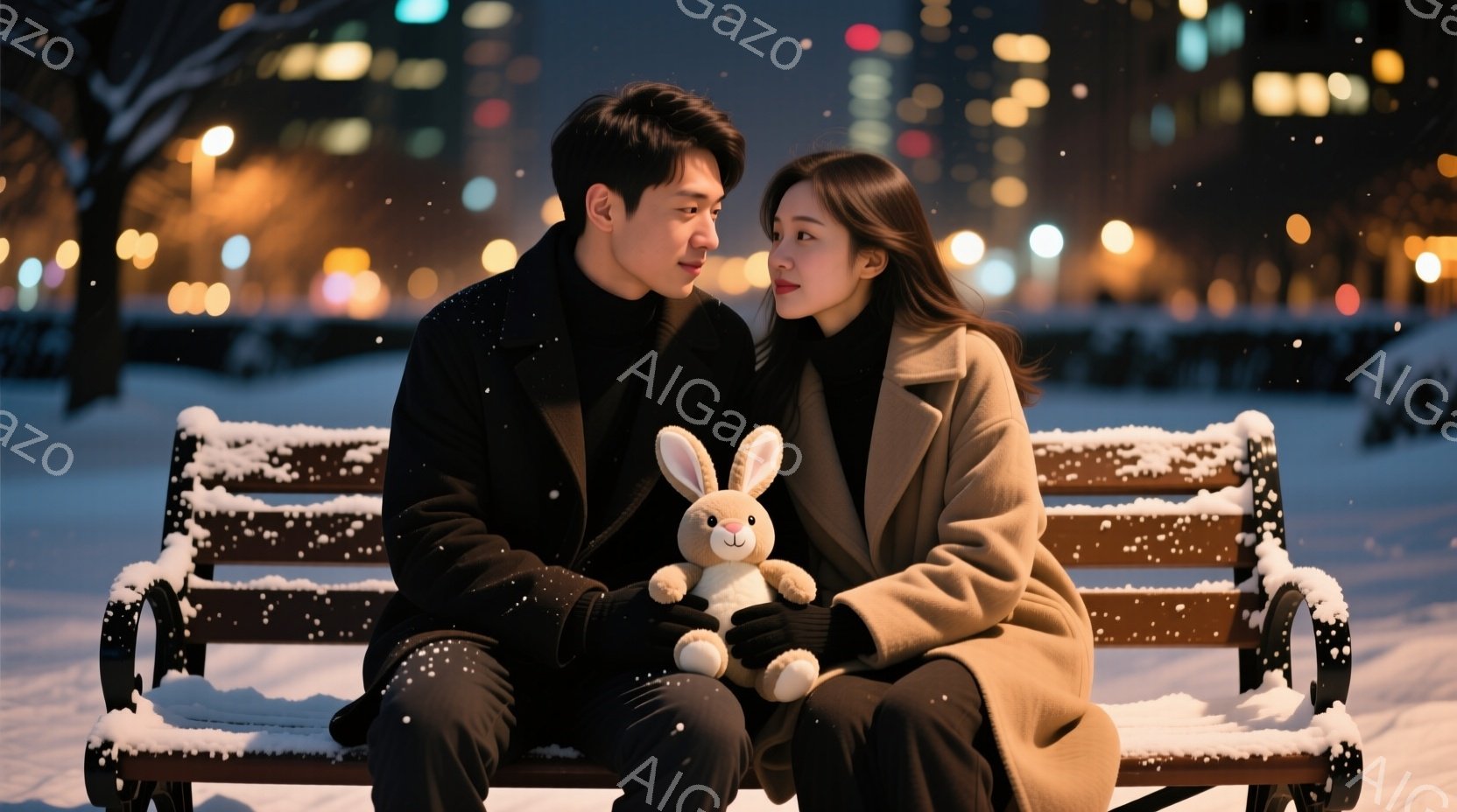 雪が降る夜、公園のベンチに若い男女が寄り添って座っている。男性は黒いコート、女性はキャメルのような色の長いコートを着ており、女性は黒髪をロングで、男性は短髪である。二人の間には白いウサギのぬいぐるみがあり、お互いを見つめ合い、穏やかでロマンチックな雰囲気が漂っている。