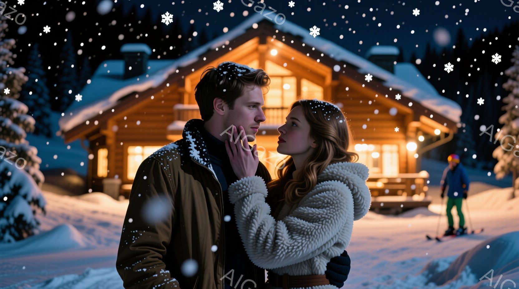 雪が降る夜、若い男女が寄り添い、お互いを見つめ合っている。男性は濃い色のジャケットを、女性は白い厚手のセーターとスカーフを着用し、愛情に満ちた表情を浮かべている。背景には暖色の光を灯したログハウスがあり、雪景色と相まって、ロマンチックで温かい雰囲気を醸し出している。