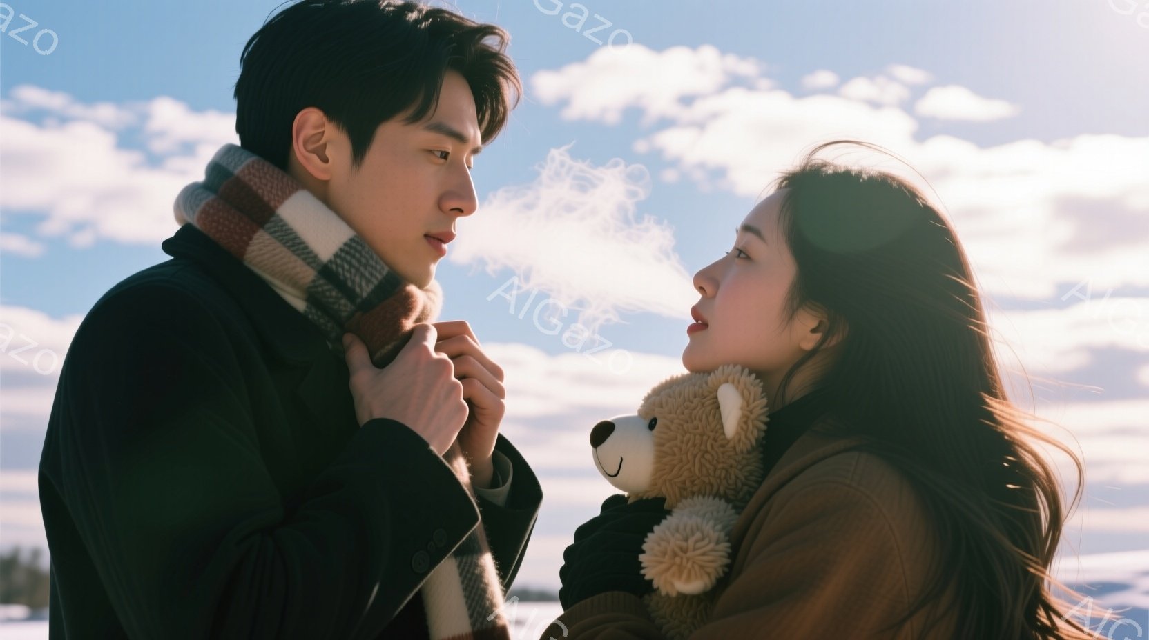 長い黒髪の女性と、短髪の男性が互いに顔を寄せ合い、冬の風景の中で寄り添っている。女性はベージュ色のセーターを着ており、抱きしめているテディベアが目立つ。背景には雪景色が広がり、空には雲が広がり、全体的に温かく穏やかな雰囲気を醸し出している。