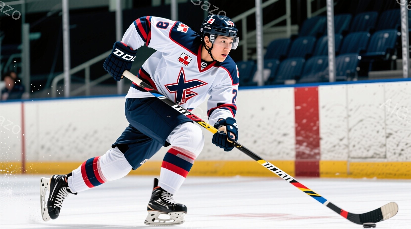 アイスホッケー選手がリンク上でプレーしている様子が写っている。彼は黒いヘルメット、赤と白のストライプが入ったジャージ、黒いズボン、スケート靴を着用し、スティックを握って前進している。背景には観客席が見え、リンク全体が明るく照らされており、競技の活気ある雰囲気が伝わってくる。