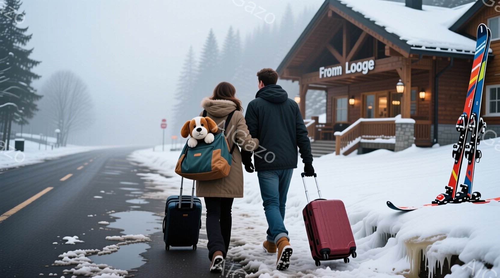 雪に覆われた道路を、一対のカップルが手荷物を持って歩いている様子が描かれている。女性は黒い帽子を被り、茶色のジャケットを着て、肩に可愛らしいぬいぐるみを抱えている。背景には「FOM」と書かれたログハウス風の建物があり、あたりは霧に包まれ、冬の静かで穏やかな雰囲気が漂っている。
