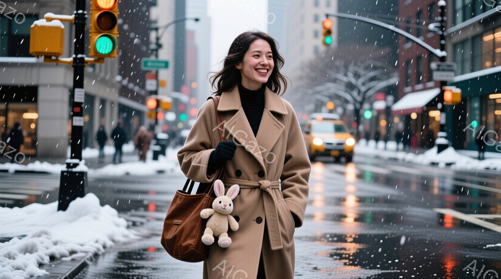 長いベージュ色のコートを着た女性が、雪の降る街路を歩いている。彼女は笑顔で、肩にかけられたバッグと片手に可愛らしいウサギの人形を持っている。背景には、ぼやけた建物や交通信号、濡れた道路、そして降り積もる雪が見え、冬の都会の雰囲気を醸し出している。