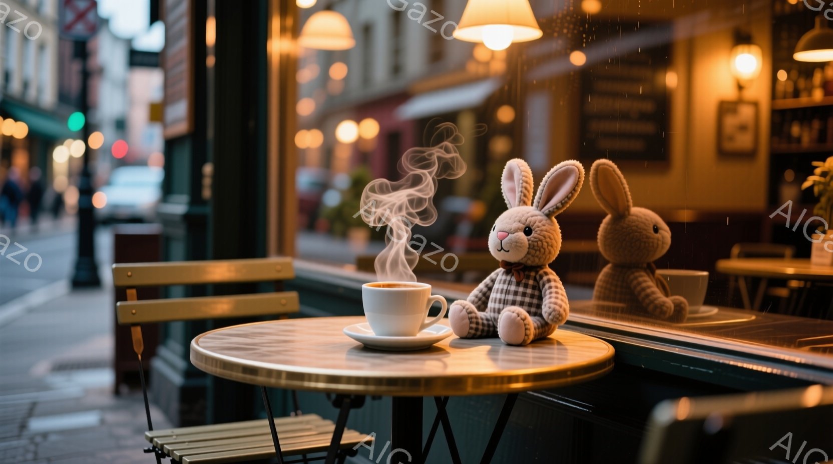 濡れた石畳のカフェのテラス席に、可愛らしいウサギのぬいぐるみ2体が座っており、温かい飲み物が供えられている。カフェの窓からは暖かな光が漏れ出し、雨に濡れた石畳と相まって、どこかノスタルジックで温かい雰囲気を醸し出している。背景にはぼやけた街並みと、点滅する信号機が見え、雨上がりの静かな午後のひとコマを切り取ったような情景である。