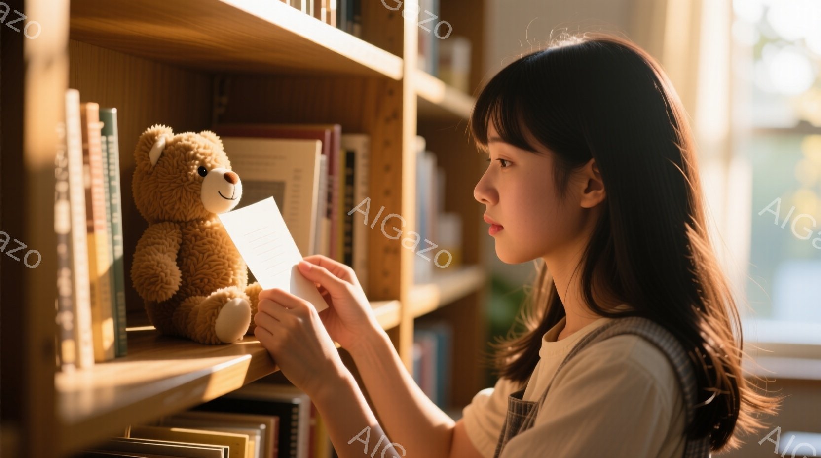 若い女性が本棚の前で白い紙を手に持っている。彼女は明るい茶色の髪で、前髪が目にかかるように切られている。穏やかな表情で、本棚に置かれたテディベアを見ているように見える。