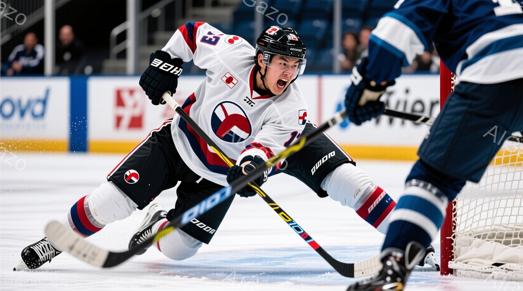 アイスホッケーの試合中の様子を捉えたもので、2人の選手が激しく競り合っている様子が描かれています。片方の選手は赤と白のユニフォーム、もう片方の選手は青いユニフォームを着用し、それぞれ顔には集中と興奮が入り混じった表情が見られます。背景には他の選手や観客が見え、試合会場の熱気と緊迫感が伝わってきます。