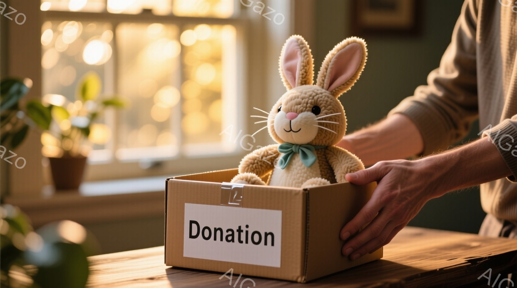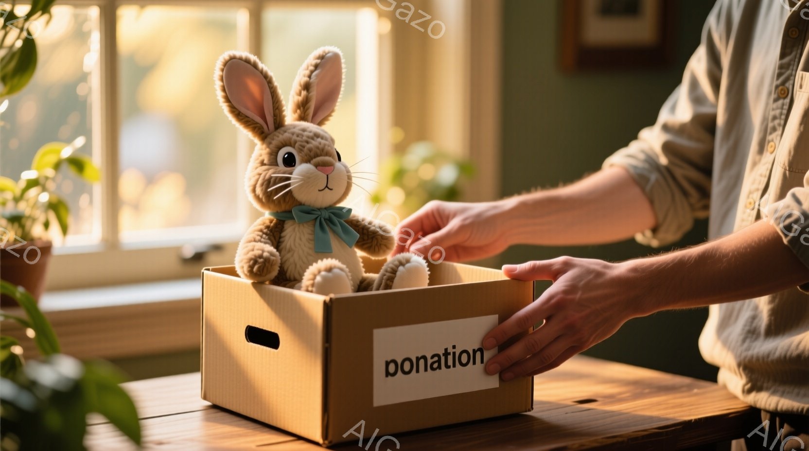 窓から差し込む光が、寄付と書かれた段ボール箱の中のふわふわのウサギのぬいぐるみ照らしている。箱を持つ手はカジュアルなシャツを着ており、背景には緑の植物が見える穏やかな室内空間が広がっている。全体的に、温かく優しい雰囲気で、誰かの善意を表しているように感じられる。