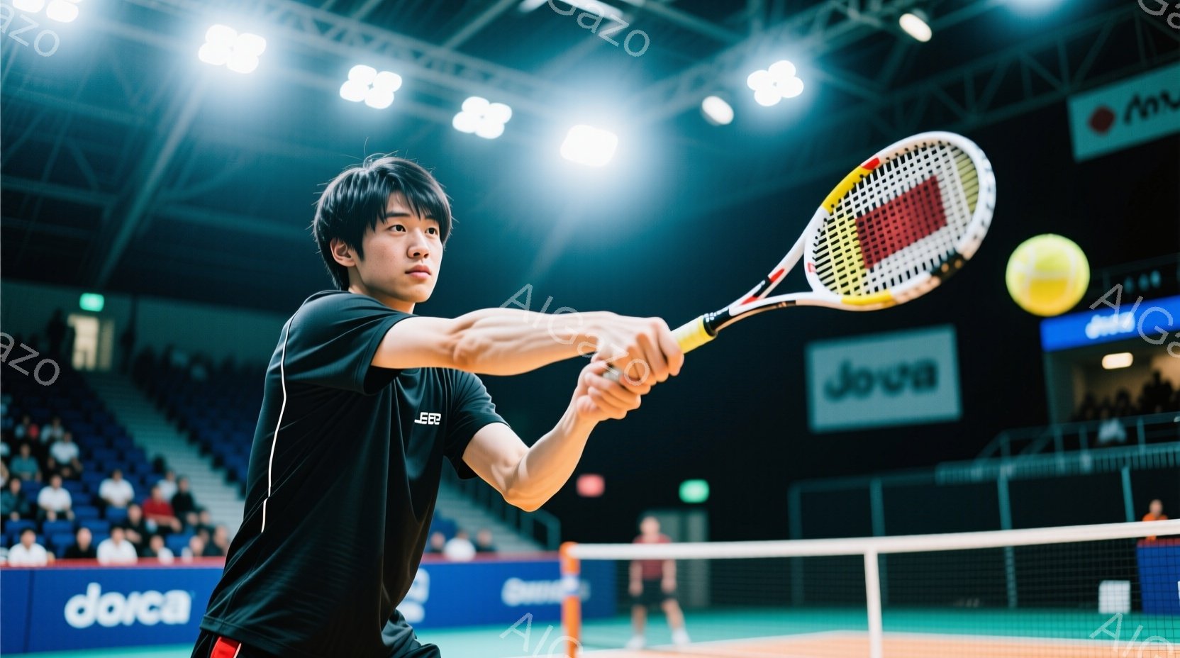 男子は黒いTシャツを着て、短い黒髪で、テニスラケットを力強く振りかぶっている。彼はコートでテニスボールを打ち返し、集中した表情でプレーに臨んでいる。背景には観客席があり、多くの観客が彼を見守っている室内競技場であることがわかる。