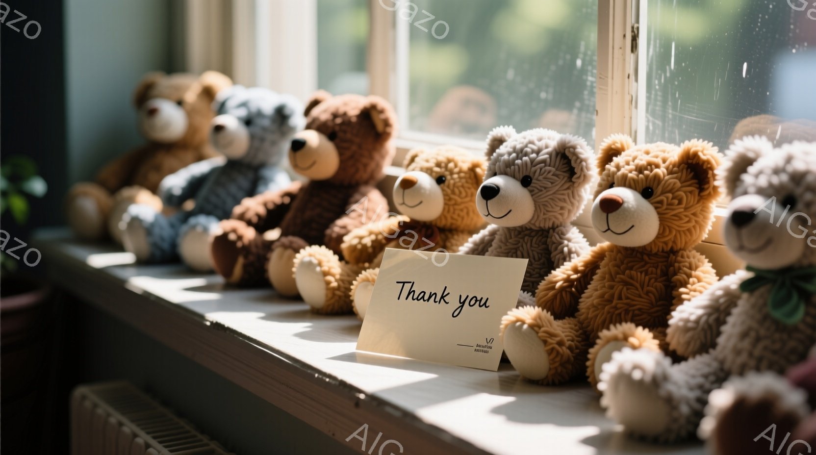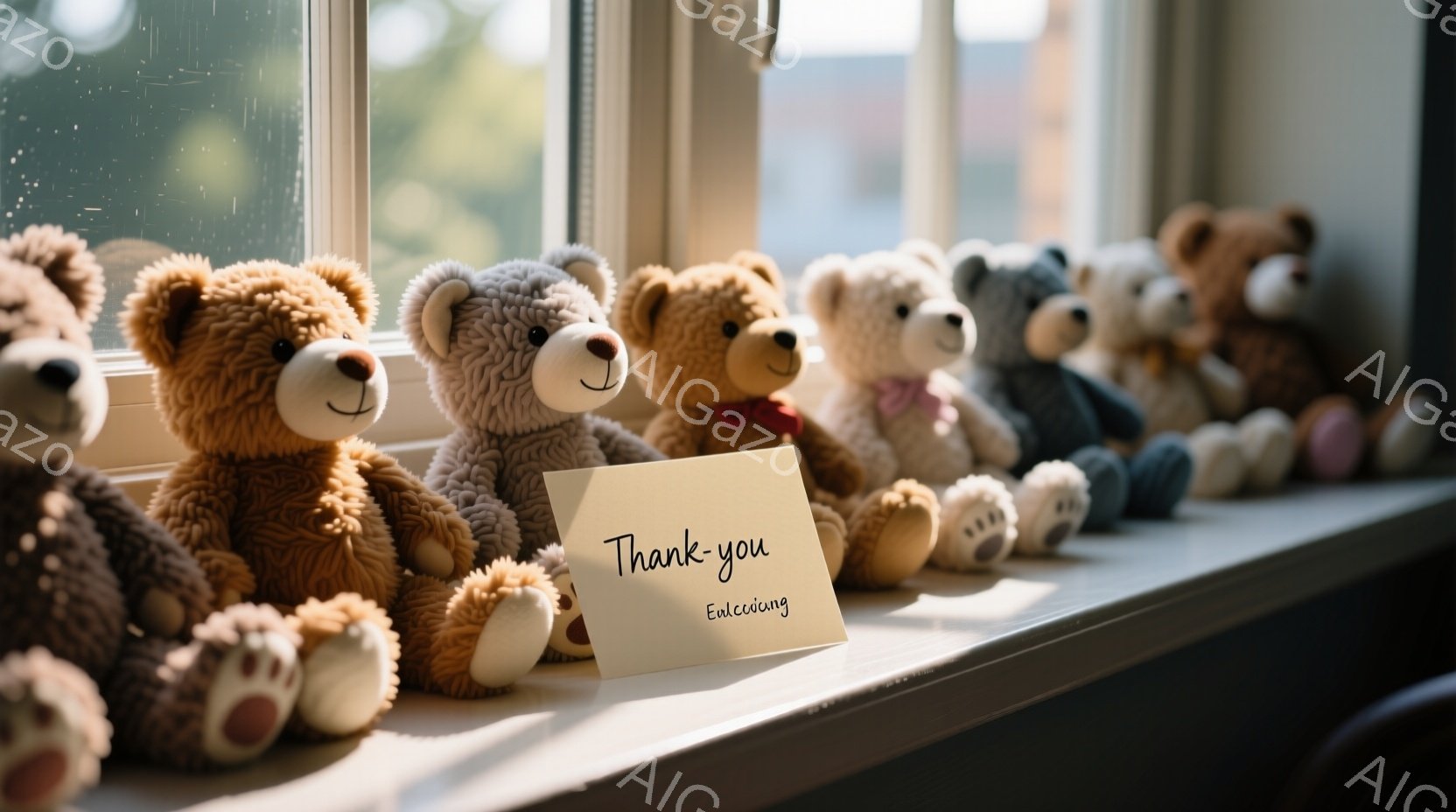 窓辺に様々な色のテディベアが整列しており、その中央には「Thank you」と書かれたカードが置かれている。背景にはぼやけた緑の木々が見え、柔らかい光が差し込んでいるため、温かく穏やかな雰囲気が漂っている。テディベアたちはそれぞれ異なる色や表情をしており、可愛らしい印象を与える。