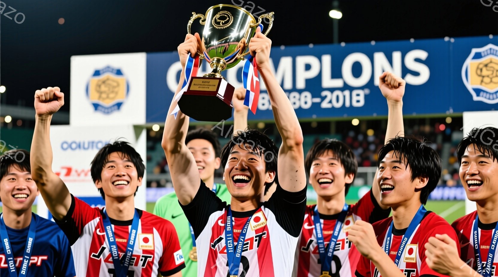 選手たちは赤いユニフォームと金色のメダルを身につけ、歓喜の表情でトロフィーを高々と掲げています。黒髪で短髪の選手が多く、顔には笑顔が溢れ、勝利の喜びを表現しています。背景には大きな看板が光り、スタジアムのような場所で、興奮と熱狂に包まれた瞬間を捉えています。