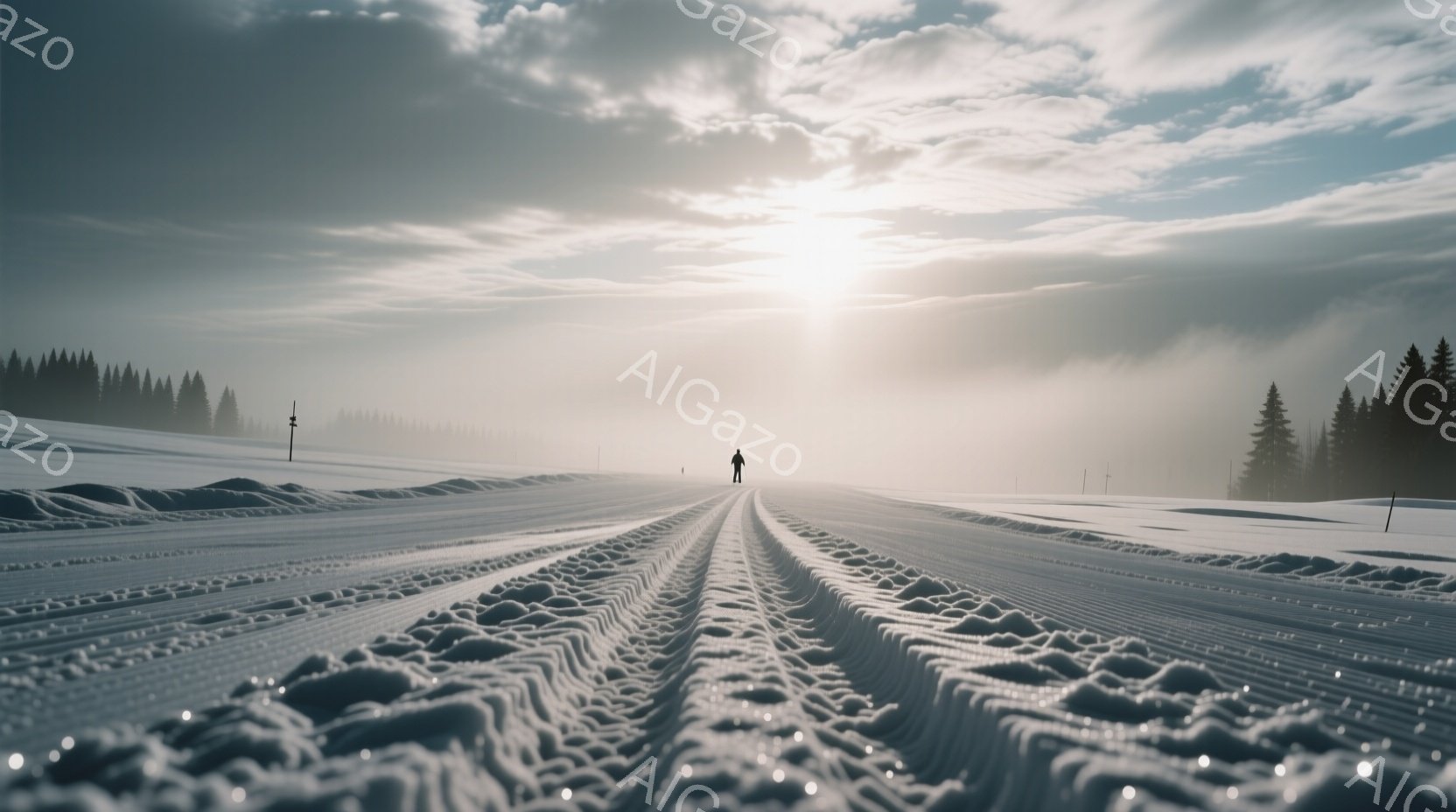 吹き荒れる雪原を、一台の雪上車が引き留めた跡が長く伸びている。遠くには雪に覆われた山々がぼんやりと見え、空は厚い雲に覆われ、強い光が雲間から差し込んでいる。全体的に厳しい冬の風景で、静寂と孤独感が漂う。