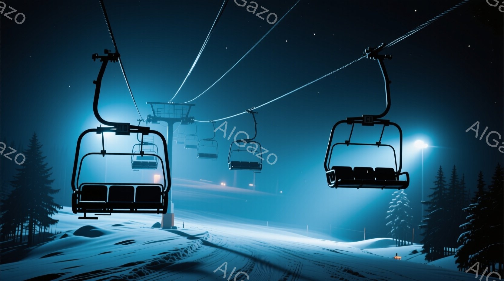 雪山の中をリフトが走っている夜の風景だ。リフトには誰も乗っておらず、青白い光に照らされた雪面と遠くに見える灯りが幻想的な雰囲気を醸し出している。背景には針葉樹林が見え、空には薄い雲が漂い、静寂で冷たい冬の夜を表している。