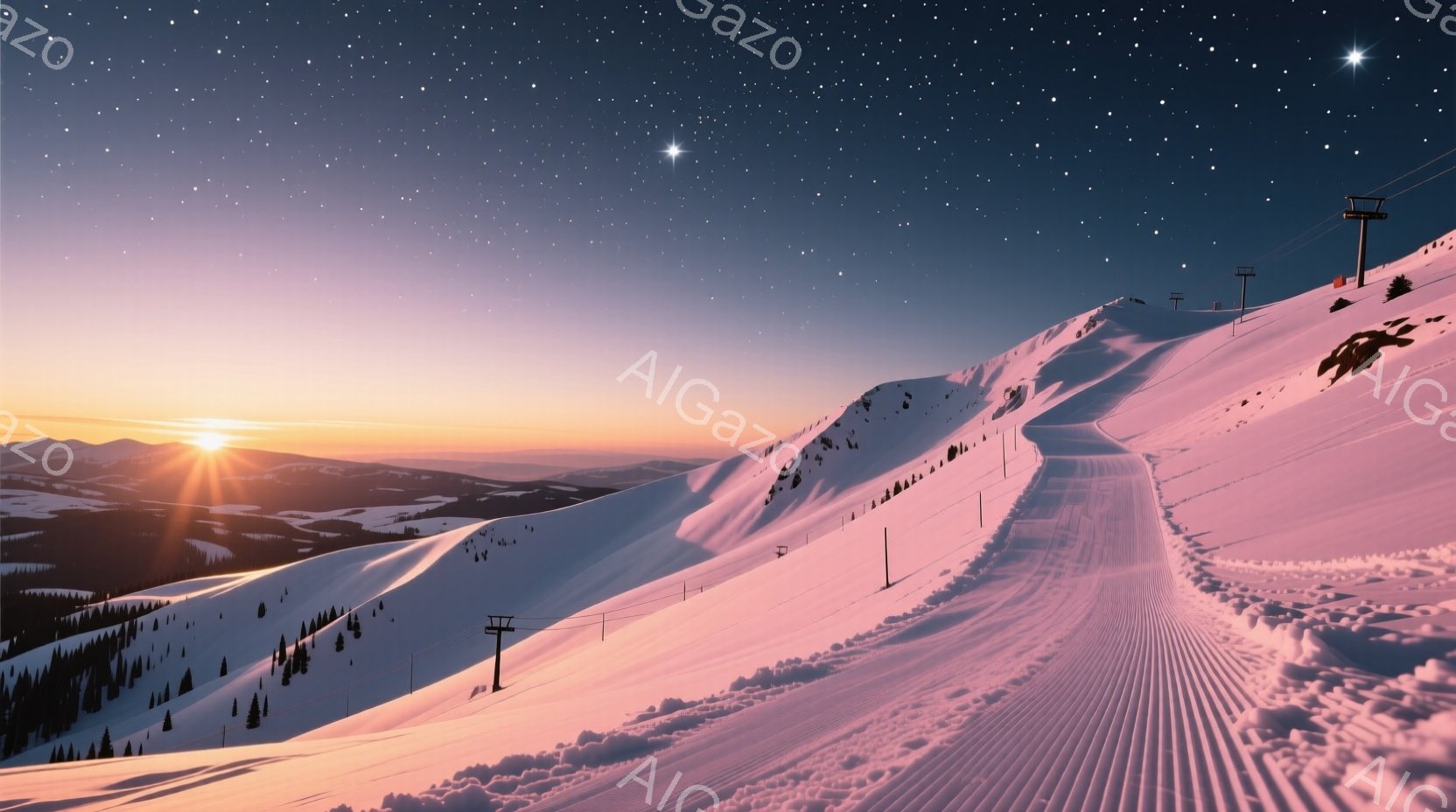 緩やかな雪山が広がり、スキー場跡が刻まれた斜面が印象的だ。遠景には霞んだ山並みが広がり、麓には街の灯りが小さく輝いている。夕暮れ時と思しき空には星が瞬き、静寂で幻想的な雰囲気が漂っている。