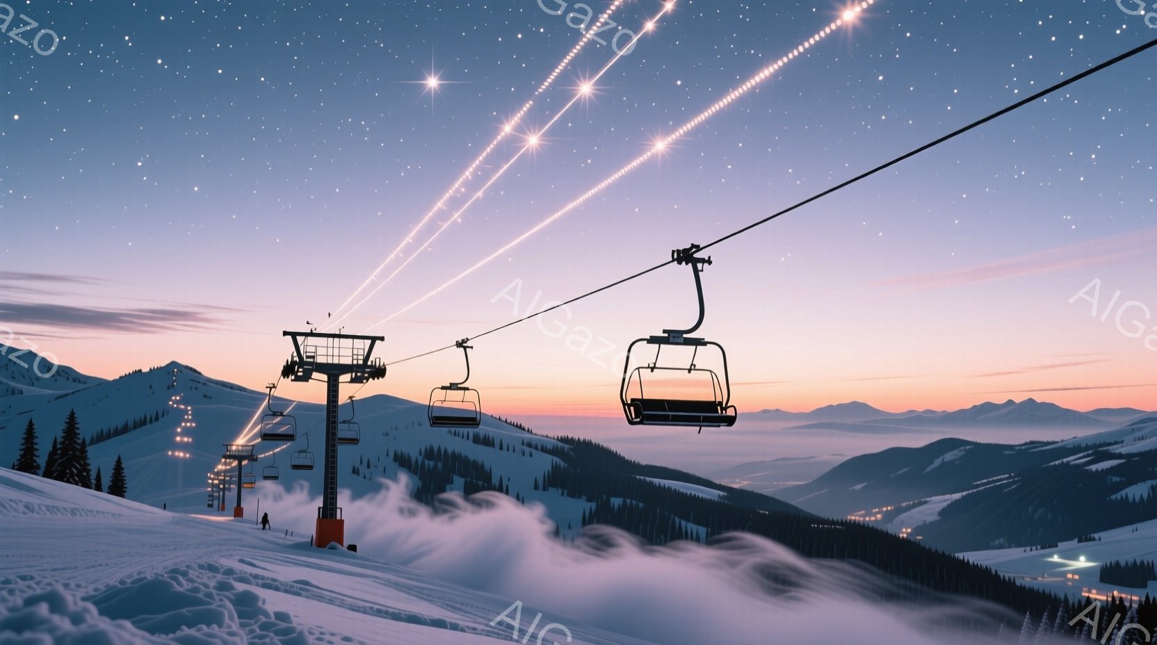 雪山を背景に、スキーリフトがいくつか並んで描かれています。朝焼けのようなピンクとオレンジ色の空が広がり、遠くの山々は雪で覆われ、幻想的な雰囲気を醸し出しています。木々が雪に覆われ、リフトの下には霧が立ち込めている様子が、冬の静寂と美しさを表現しています。