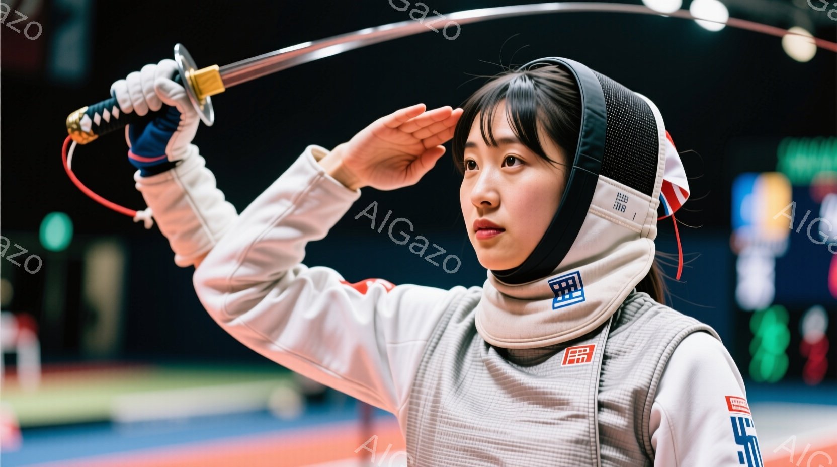 競技者は白いフェンシングユニフォームと黒いヘアバンドを着用し、真剣な表情で構えています。彼女は片手に刀を持ち、もう片手を高く上げて防御姿勢を取っています。背景にはフェンシングコートと国旗が見え、競技場の集中した雰囲気が伝わってきます。