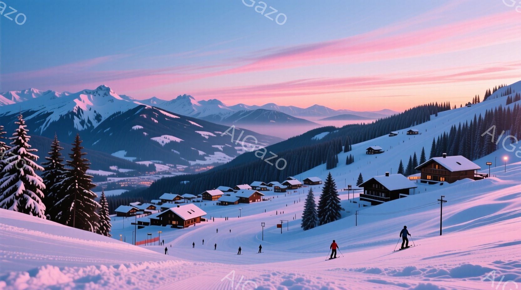 雪に覆われた山々と、麓に広がる可愛らしい村が印象的な風景です。スキーヤーが一人、整えられたゲレンデを滑走しており、暖かい服装で冬の寒さをしのいでいます。夕焼け空がピンクと紫に染まり、静かで穏やかな冬の雰囲気を醸し出しています。