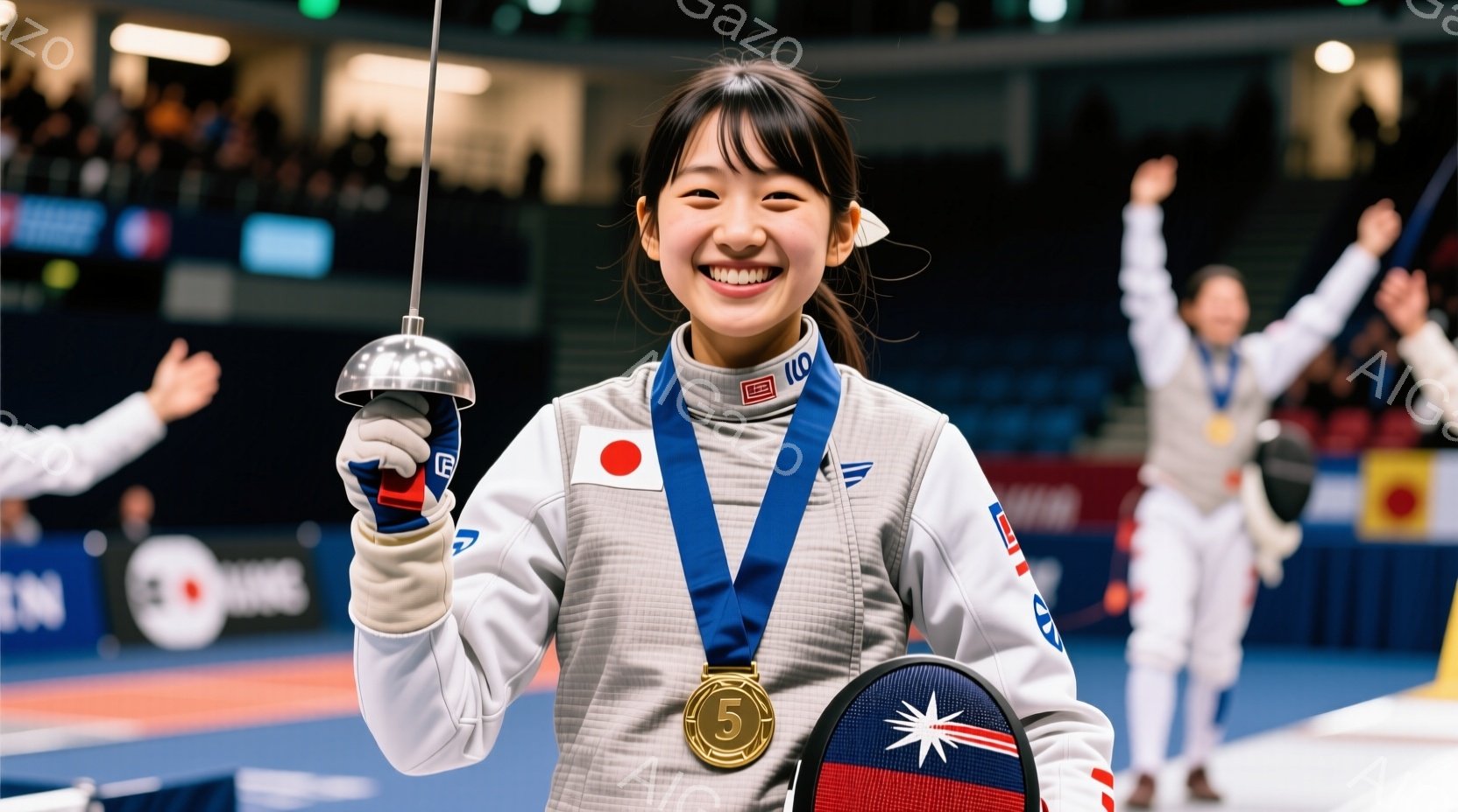 フェンシングのユニフォームを着て、金メダルを首にかけて笑顔を見せる女性アスリートが写っています。彼女は右手にフェンシングの剣を持ち、観客席が見える体育館の床に立っています。背景には他のフェンサーが勝利を祝っている様子がぼやけて写っており、全体的に勝利と喜びの雰囲気が漂っています。