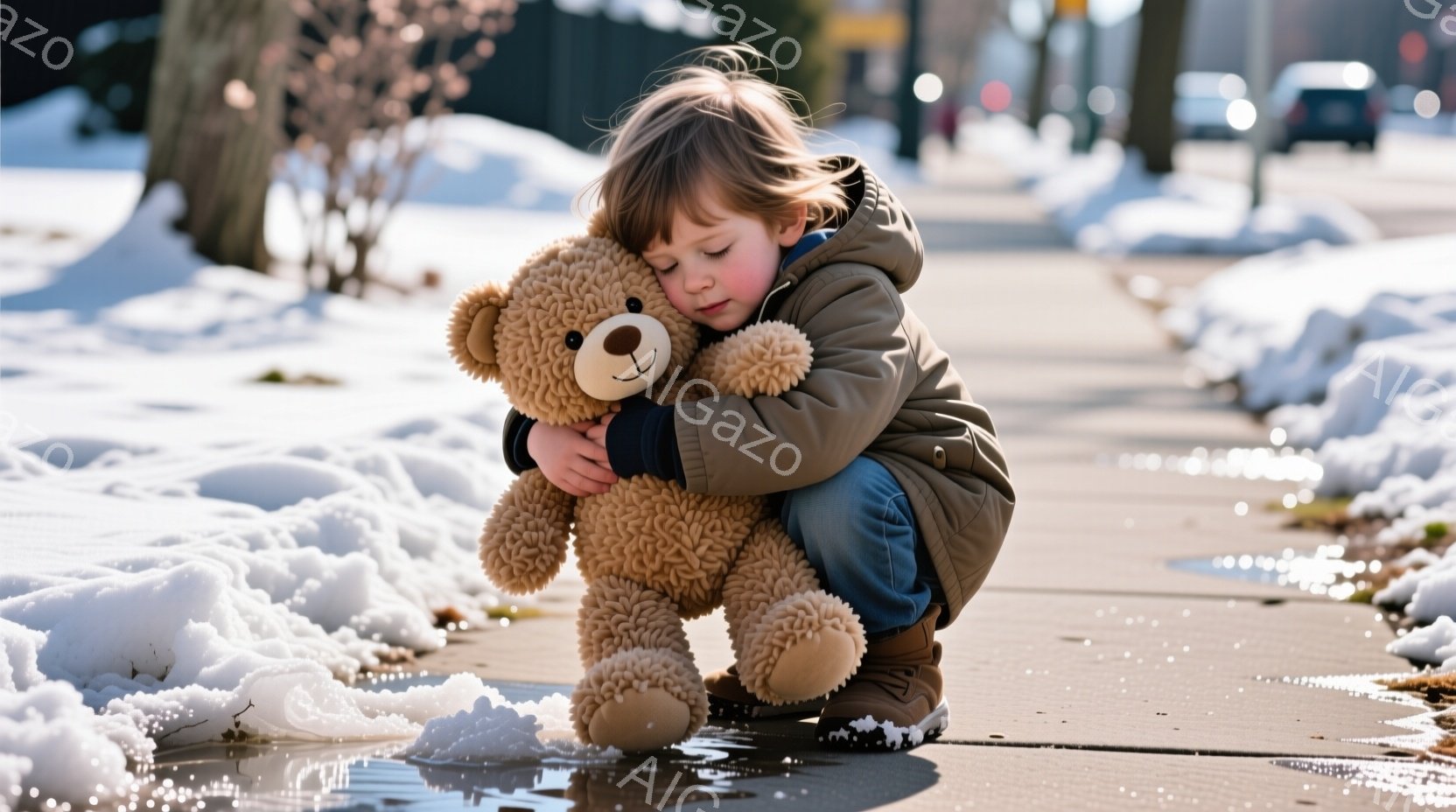 茶髪の幼い男の子が、大きな茶色のテディベアを抱きしめ、雪に覆われた歩道をうずくまっています。彼は濃い青色のジーンズと黒と白の靴を履き、濃い緑色のジャケットを着ています。背景には雪で覆われた道路と、ぼやけた建物があり、全体的に暖かく、優しく、冬の雰囲気を感じさせます。