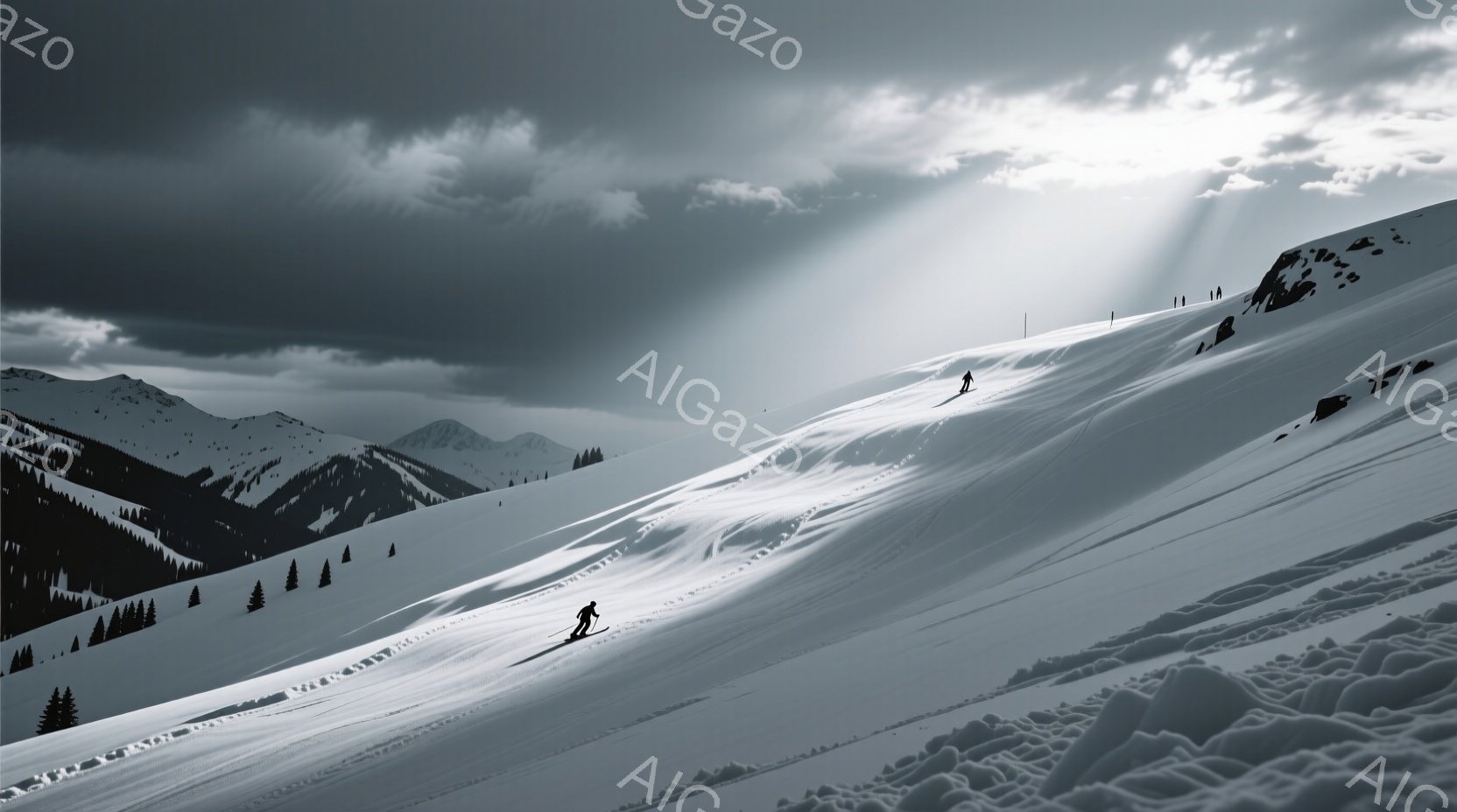 険しい雪山の風景で、太陽の光が雲間から差し込み、雪面にまばゆい光の筋が伸びている。山肌は雪で覆われ、針葉樹の森が麓に広がっている。全体的に静寂で荘厳な雰囲気であり、冬の自然の雄大さを感じさせる。