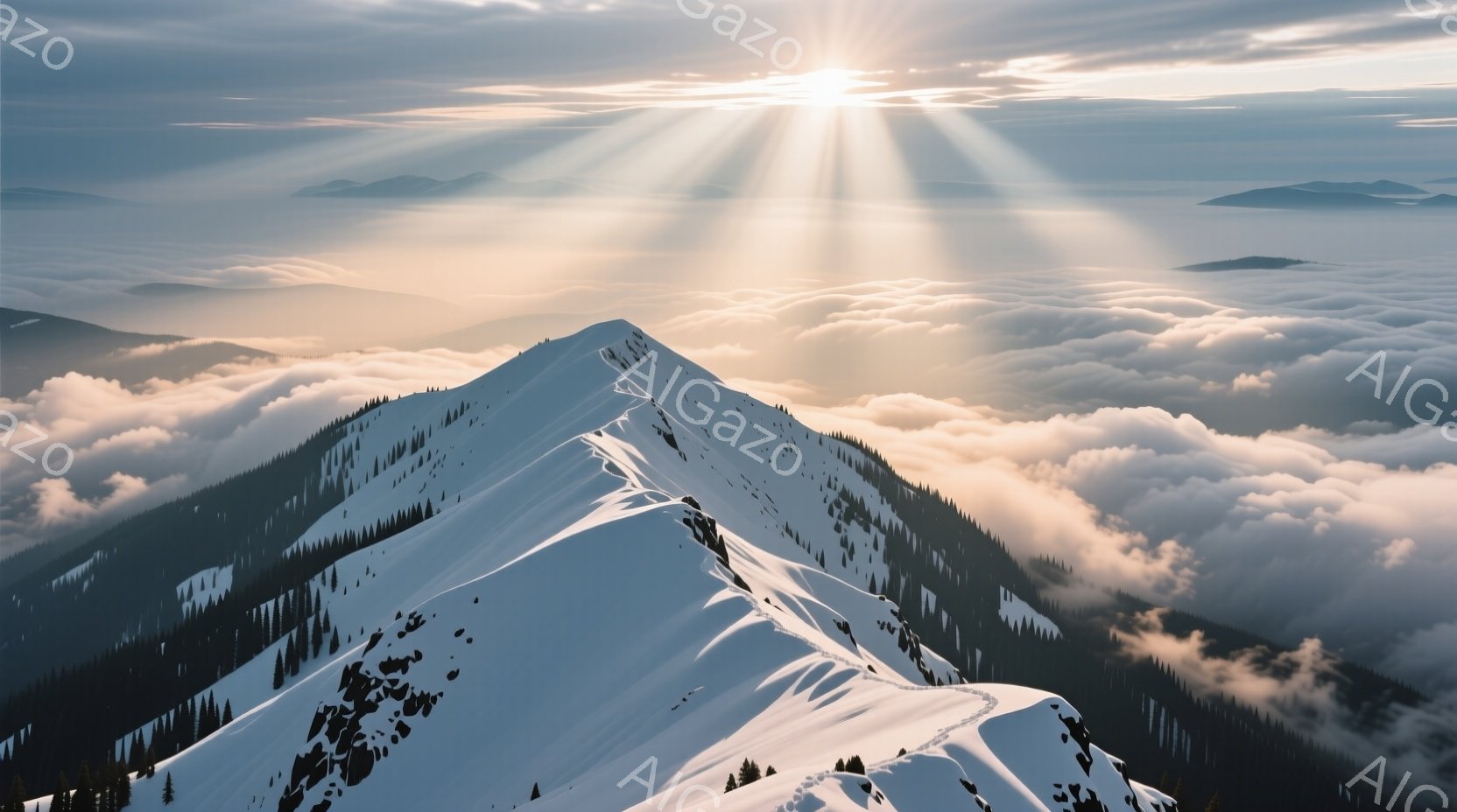 鮮やかな雪山が雲海から顔を出し、朝日が眩しい光線を投げかけている。山頂付近の雪はきめ細かく、山の稜線は鋭く、力強い印象を与える。雲海はまるで白い波のようで、山々を包み込み、幻想的な雰囲気を醸し出している。
