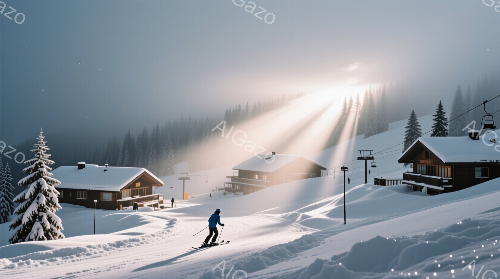 晴れた冬のスキー場で、雪が降り積もった斜面をスキーヤーが滑っている様子が描かれています。木造の建物が点在し、背景には雪を抱いた山々が広がり、太陽光線が雲間から差し込み幻想的な雰囲気を醸し出しています。スキーヤーは黒いスキーウェアを着用し、滑降の姿勢でスピード感のある動きを見せています。