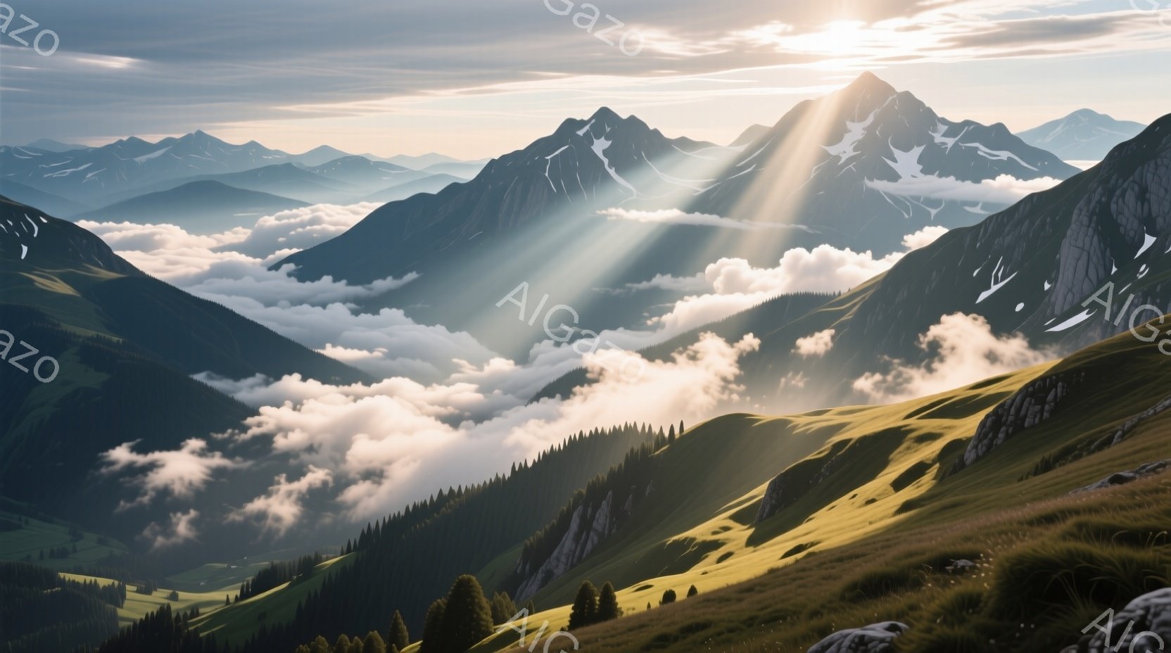 険しい山々が雲海から顔を出し、朝日が差し込んでいる風景です。緑豊かな斜面には針葉樹林が広がり、強い光線が雲の間から差し込み、神秘的な雰囲気を醸し出しています。全体的に、雄大で荘厳な自然の美しさを捉えた、静寂と希望に満ちた光景です。