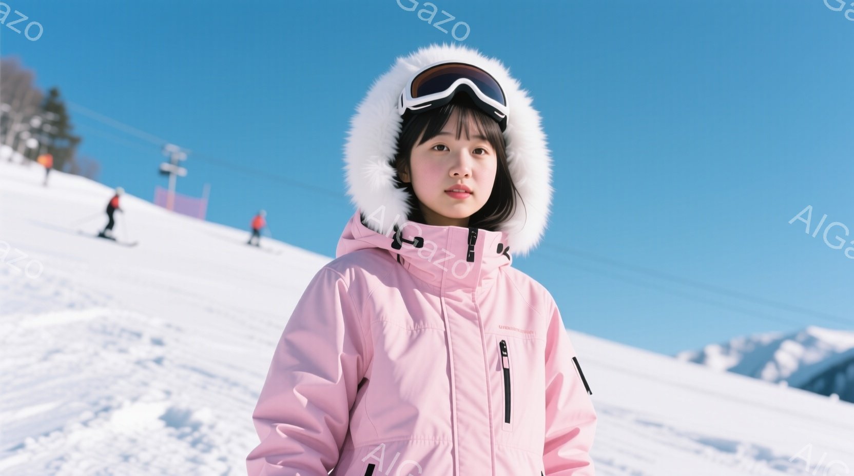 明るい雪景色の中で、ピンクのパーカーを着た若い女性がこちらを見ている。彼女は黒髪で、顔には微笑みが浮かび、冬の寒さから守るようにフードを深く被っている。背景には雪山と青空が広がり、スキーヤーの姿も見え、冬の日のアクティブな雰囲気が漂っている。