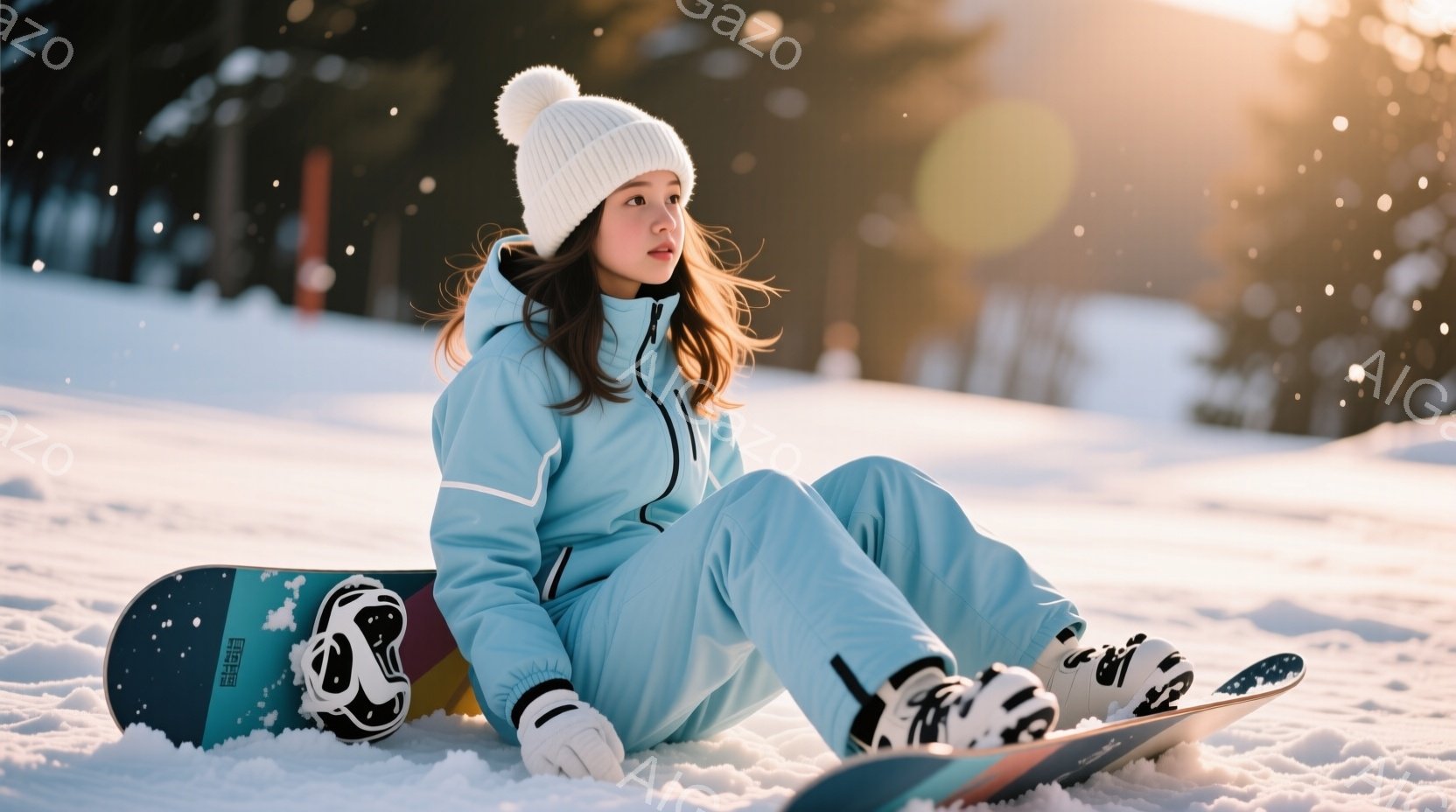 青いスキーウェアに身を包んだ女性が雪の上に座っている。彼女は白いニット帽をかぶり、茶色の髪を耳から覗かせている。背景には白い雪景色が広がり、暖かい日差しが差し込んでいる。