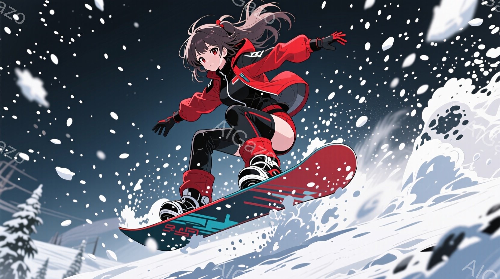 スノーボードを楽しむ女性が描かれています。彼女は赤と黒のジャケット、黒のズボン、そしてスノーボードブーツを着用し、髪は茶色で少しウェーブがかかっています。背景には雪山と雪が舞っており、活気ある冬の雰囲気が表現されています。