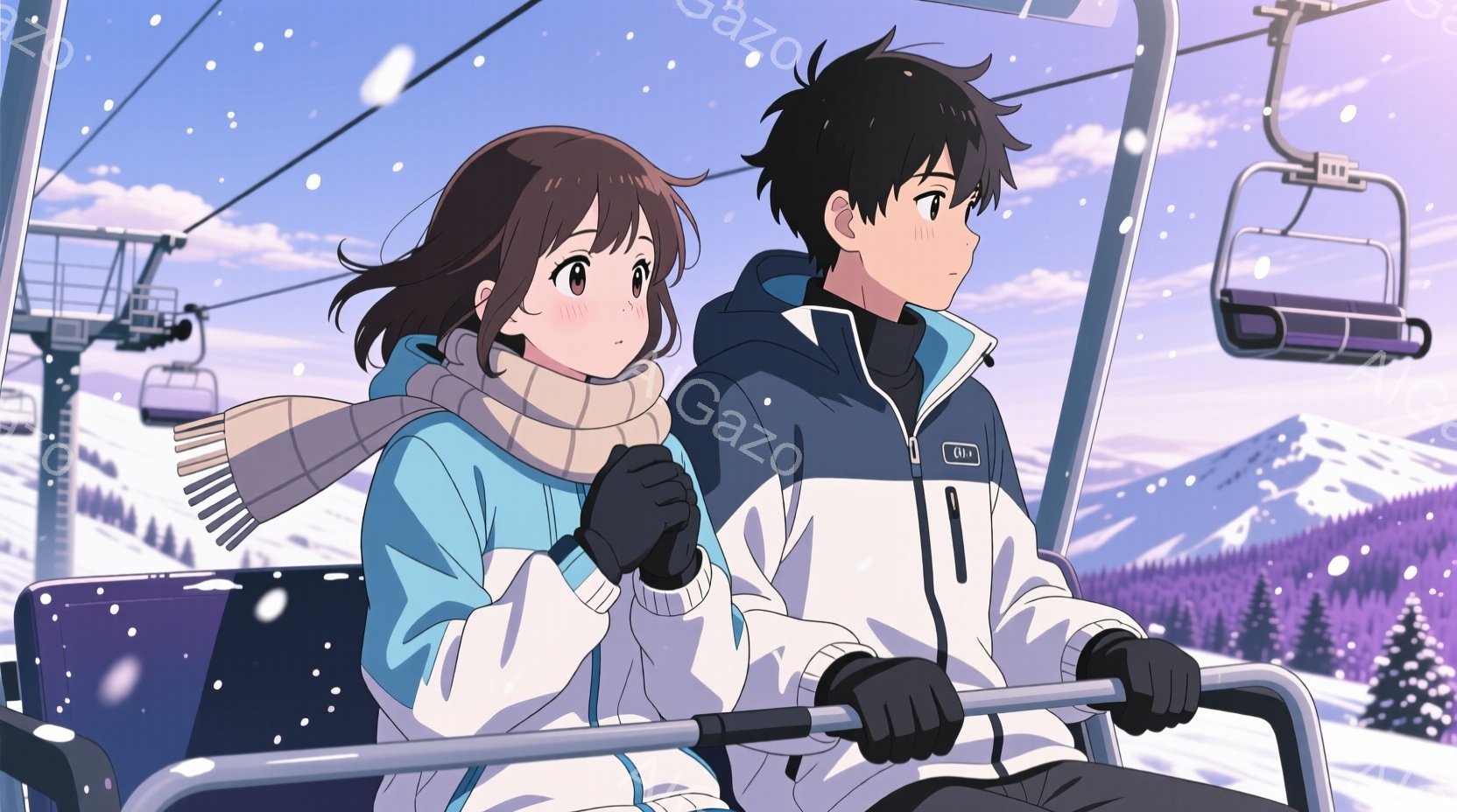 雪が降る夜、スキーウェアを着た男女が手をつないで立っている。女性は赤色のスキーウェアに茶色の長い髪、ゴーグルを頭に乗せて笑顔を見せている。背景には暖かく光る木造の建物があり、雪景色の中で温かい雰囲気を醸し出している。