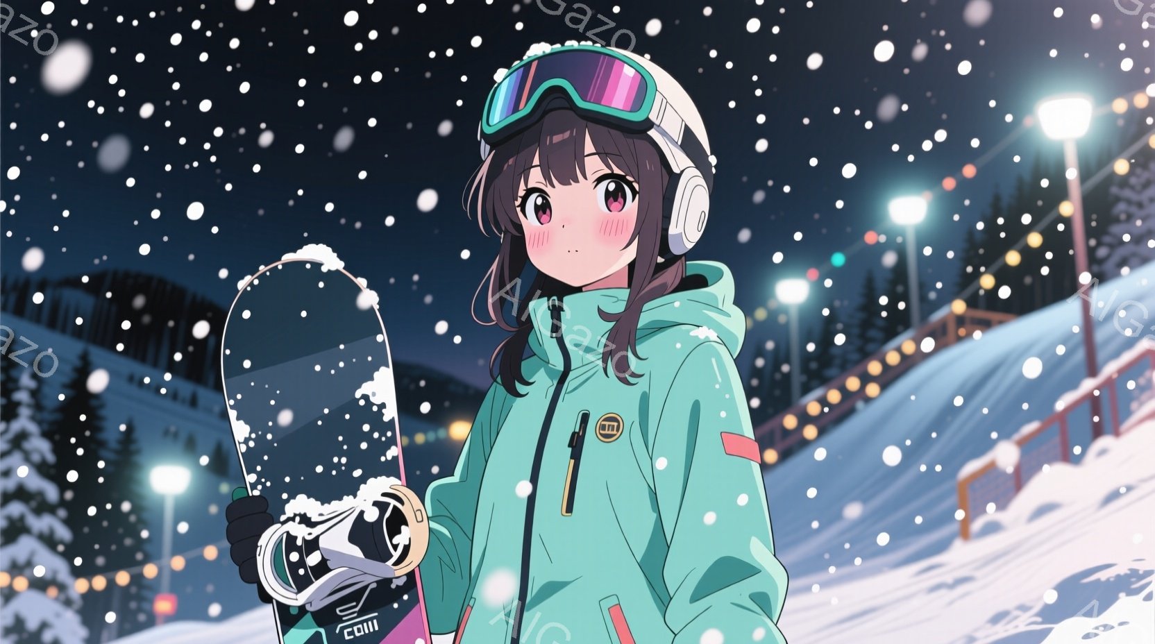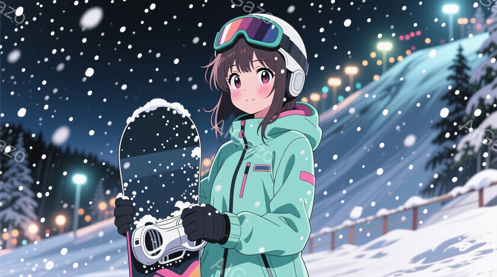 雪が舞うスキー場で、ターコイズ色のウィンドブレーカーを着た少女が描かれている。彼女は黒髪で、前髪を少し残し、顔には赤みが差しており、ボードを片手に持ち、少し照れたような表情をしている。背景には雪に覆われた山々とスキー場の照明が点在し、冬の冷たく美しい雰囲気が漂っている。