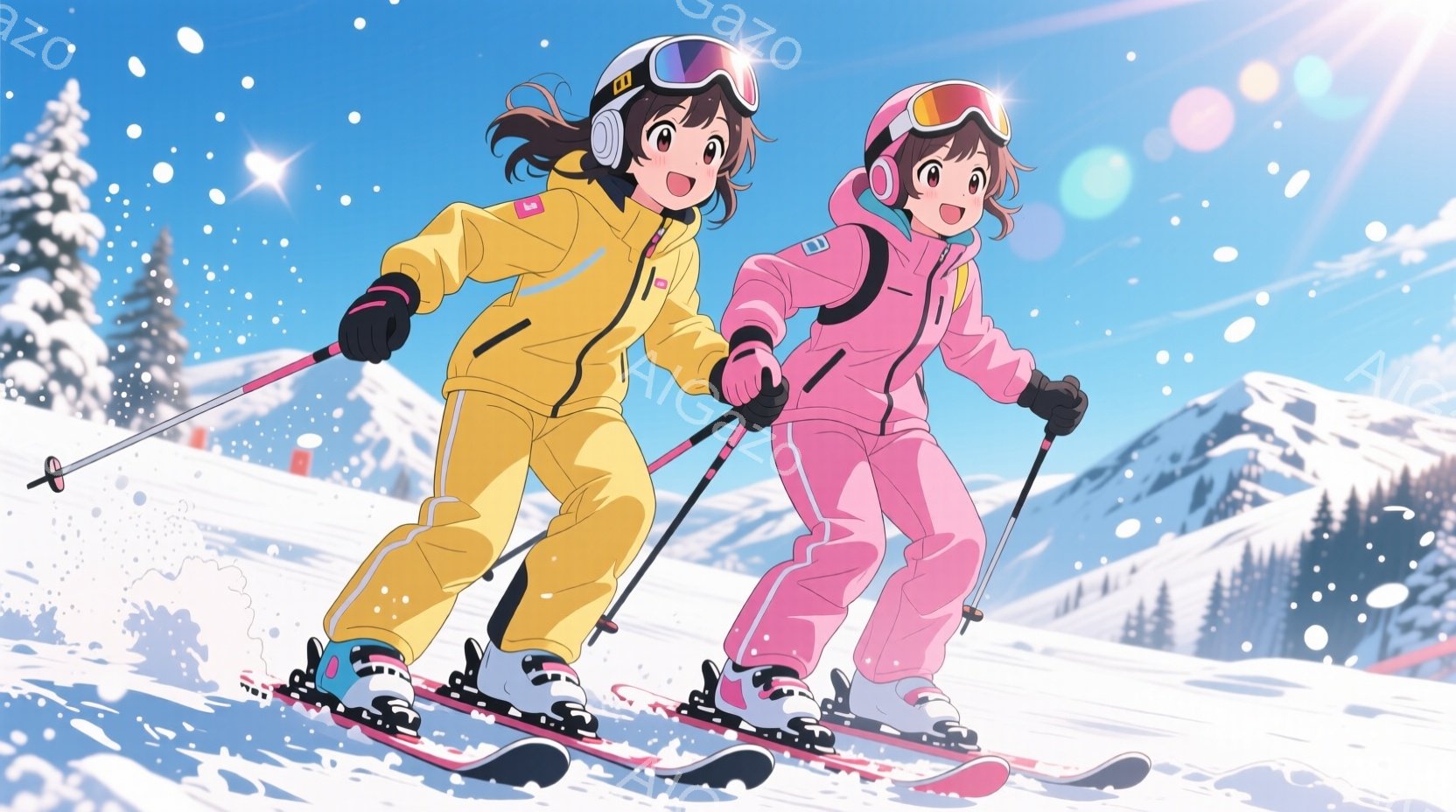 雪山をスキーで滑る二人の少女が描かれています。黄色いスキーウェアを着た少女は、黒髪をポニーテールにし、笑顔で滑走しています。背景には雪に覆われた山々と針葉樹林が広がり、晴天の下、雪が舞う冬の風景が広がっています。