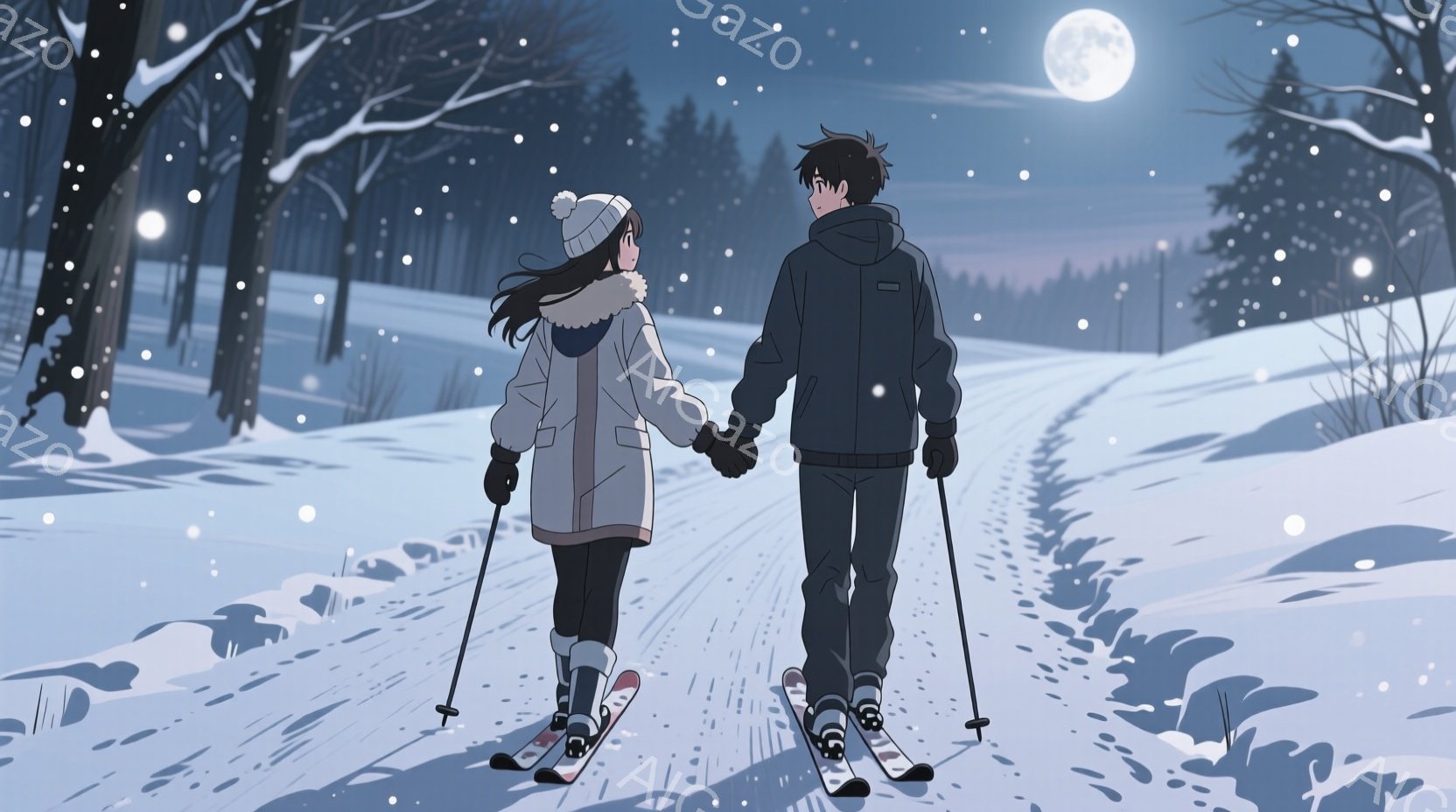 雪道を男女が手をつないで歩いている。女性はロングヘアで、赤いマフラーを巻いて、スキー板とストックを持っている。背景には雪に覆われた木々と、満月が輝く夜空が広がり、静かでロマンチックな雰囲気を醸し出している。