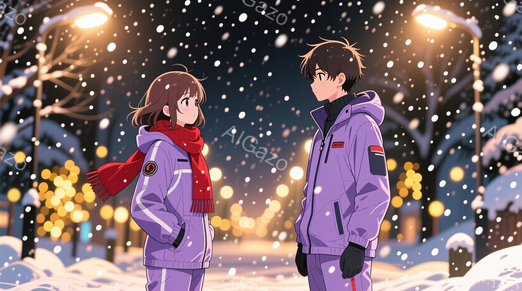 雪が降る夜の公園で、若い男女が並んで立っている。女性は茶色の短い髪で、ピンク色のスキーウェアとマフラーを着用し、男性は黒髪で、同様のスキーウェアを着ている。背景にはぼやけた街灯と雪に覆われた木々が見え、全体的に穏やかでロマンチックな雰囲気を醸し出している。