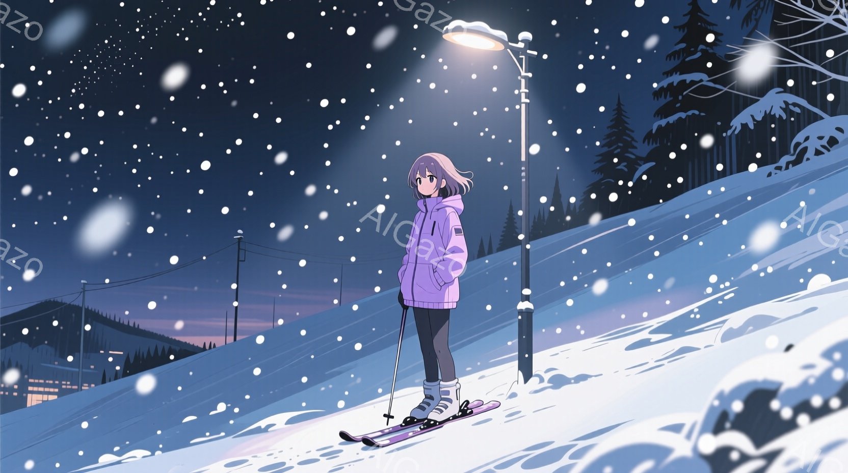 雪が降る夜のスキー場で、紫色のジャケットを着た少女が立っている。彼女は薄いピンク色の髪を持ち、少し微笑んでいるように見える。背景にはスキーリゾートの建物や木々が見え、夜空にはオレンジと紫のグラデーションが広がっている。
