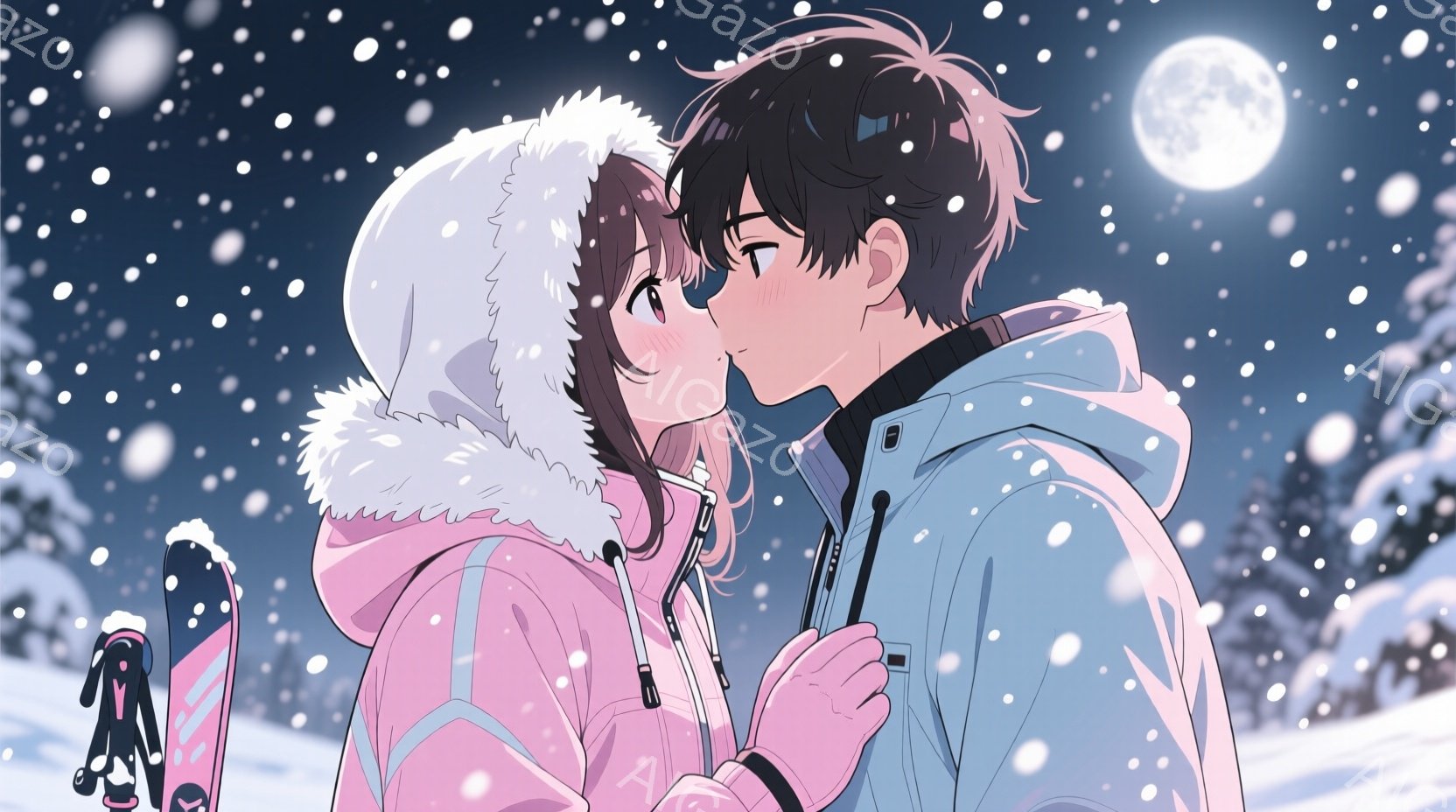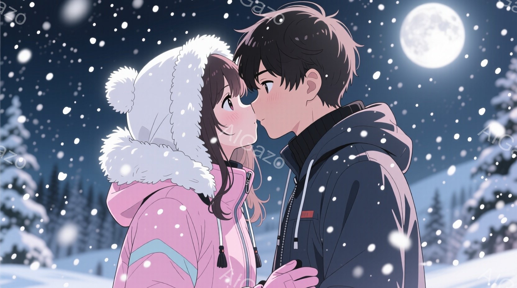雪の中で寄り添う男女が描かれています。女性はピンクのフード付きジャケットに白い手袋をつけ、頬を赤らめて微笑んでいます。男性は水色のジャケットを着て、女性の顔に近づき、優しげな表情をしています。背景には雪景色が広がり、遠くには木々が見え、満月が輝いています。