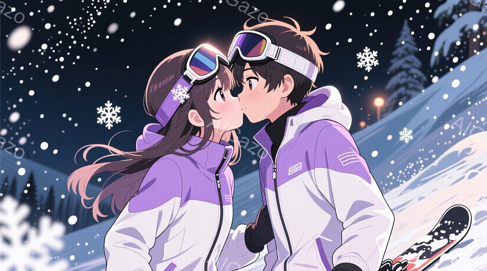 雪が降る夜のスキー場で、若い男女が寄り添いながら微笑んでいます。女性は紫色のスキーウェアに長い茶色の髪をサイドテールでまとめ、男性は白いスキーウェアに黒髪で、両者ともゴーグルを着用しています。背景には雪景色が広がり、遠くに街の明かりが見え、暖かくロマンチックな雰囲気を醸し出しています。