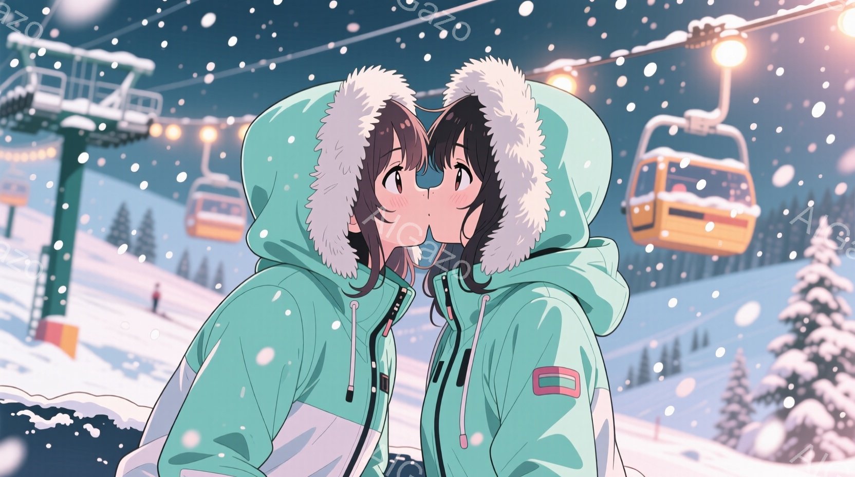 雪が舞う中で、若い男女が互いに顔を寄せ合い、キスしようとしている場面が描かれています。女性は茶色の髪をサイドに流し、黄色いスキーウェアに身を包み、頬を赤らめています。男性は黒髪で、同様のスキーウェアを着ており、女性を見つめています。
