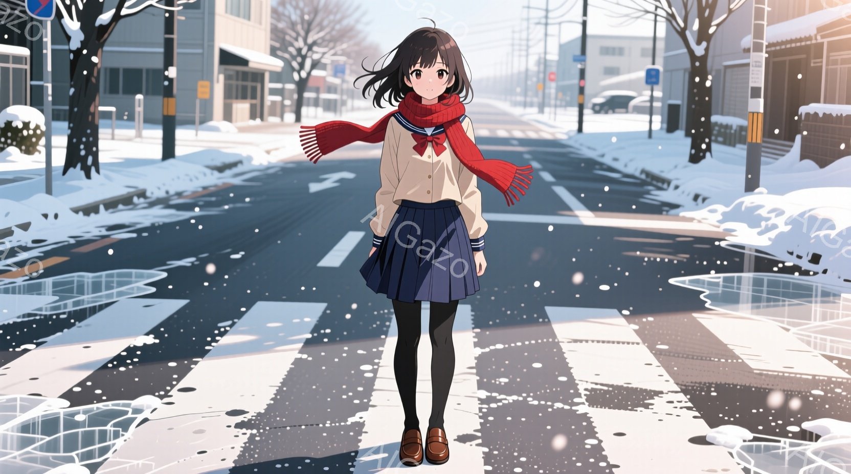 少女が雪の降る横断歩道に立っている様子が描かれています。彼女は短い茶色の髪で、紺色のスカートと白いセーター、赤いマフラーを身につけており、少し不安そうな表情をしています。背景には雪に覆われた道路と建物、そして曇り空が広がっており、冬の静かで寂しげな雰囲気を醸し出しています。