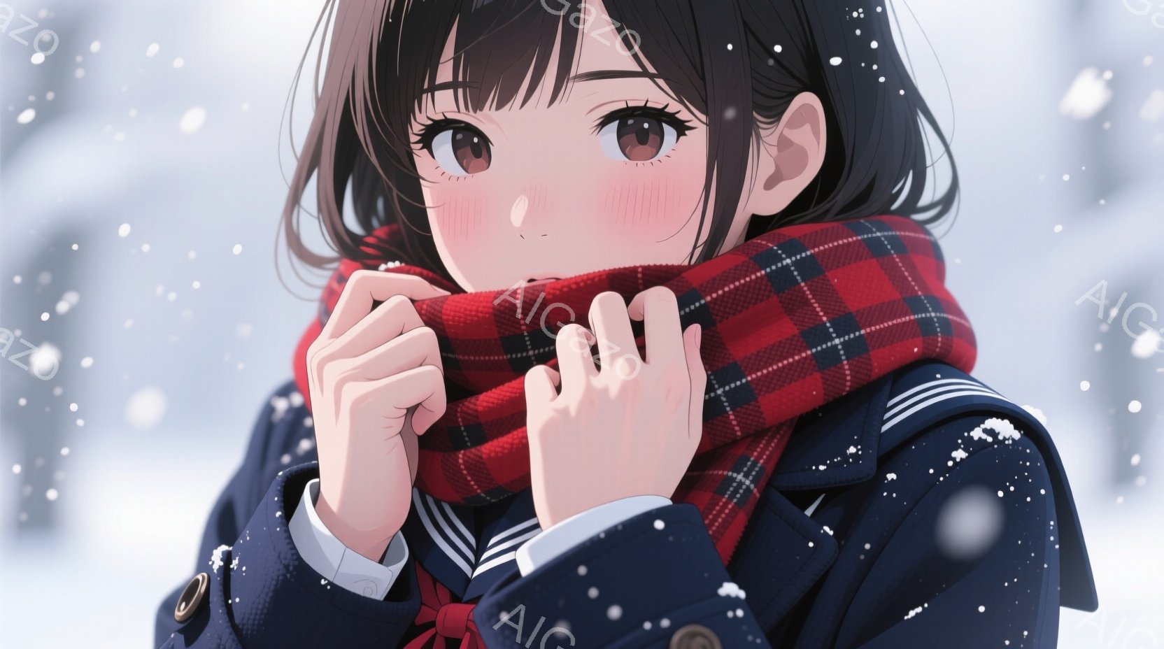 暗い髪の少女は、赤いチェック柄のマフラーを抱きしめるようにして立っています。紺色のセーラー服を着ており、頬は少し赤らんでいます。背景にはぼやけた建物と舞い散る雪が見え、寒く、少し寂しげな冬の雰囲気が漂っています。